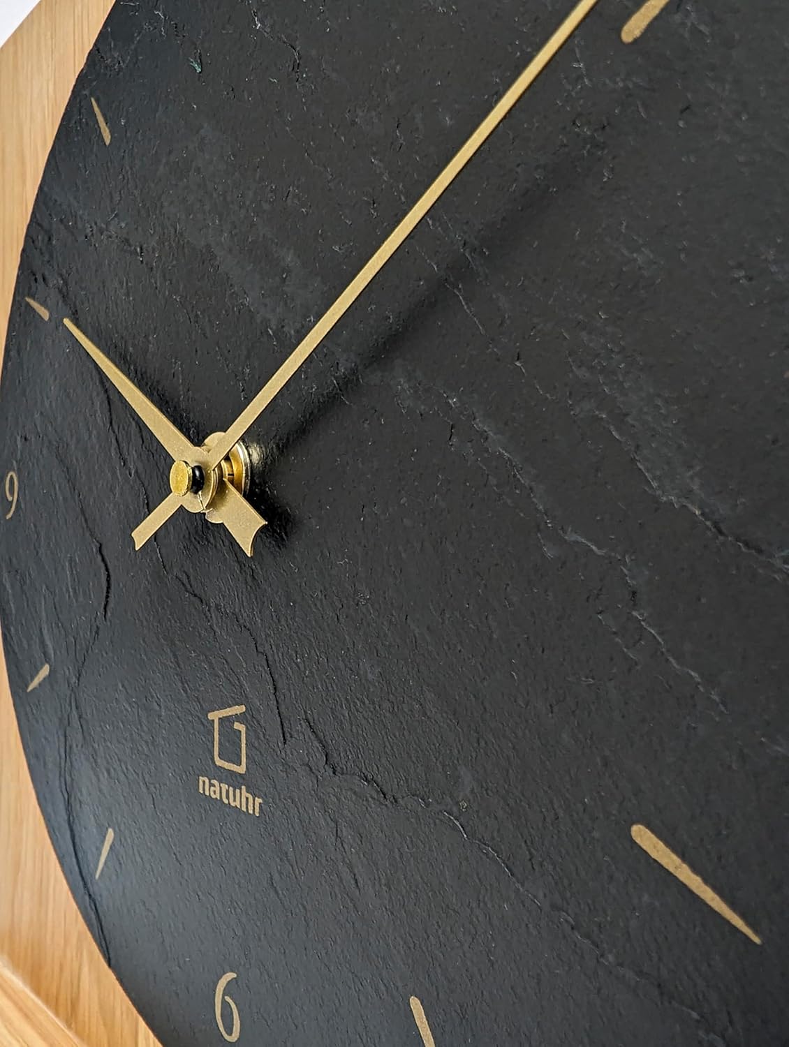 - Exklusive Beschichtung aus Schiefer mit goldfarbenem Druck und filigrane, goldfarbene Zeiger aus Metall
