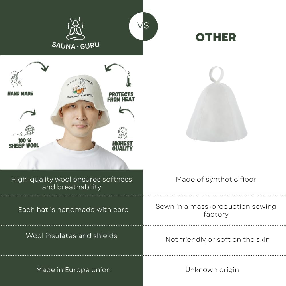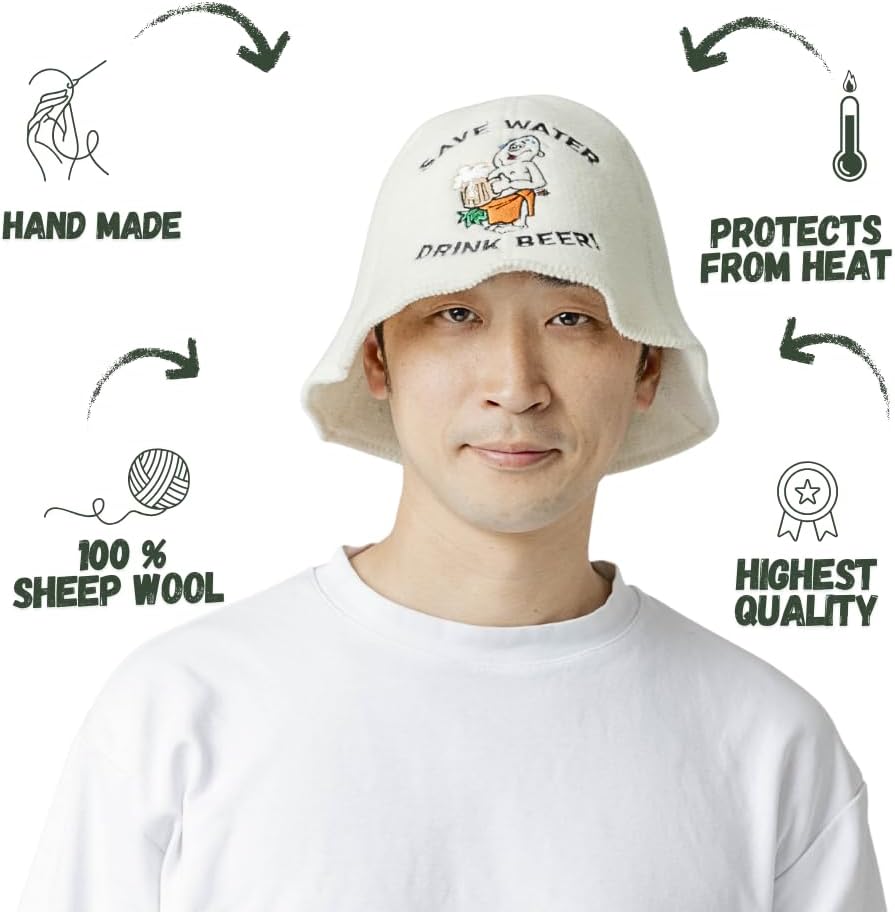 - Saunamütze: unsere Saunamützen bestehen aus Materialien höchster Qualität und höchster Qualitätsstandards, die Sie erwarten sollten. Unsere Produkte werden mit hochwertigen japanischen Stickmaschinen der neuesten Generation und besonders hochwertigen deutschen Stickgarnen bestickt. Hergestellt in der Litauen, EU