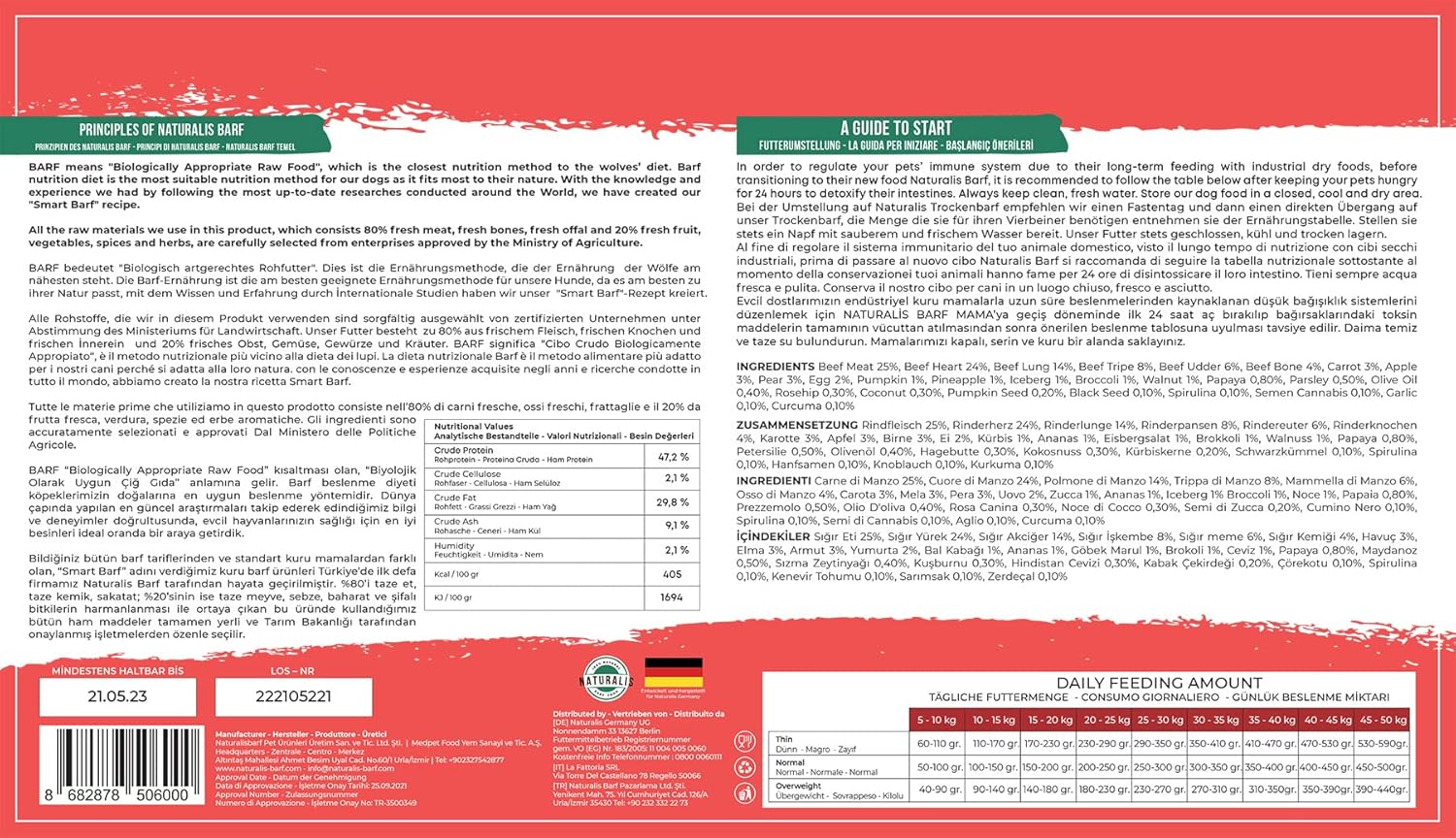 - ZUSAMMENSETZUNG Naturalis Trockenbarf Rind, alles drin: Rindfleisch 25%, Rinderherz 24%, Rinderlunge 14%, Rinderpansen 8%, Rindereuter 5%, Rinderknochen 4%, Karotte 3%, Apfel 3%, Birne 3%, Ei 2%, Kürbis 1%, Ananas 1%, Eisbergsalat 1%, Brokkoli 1%,