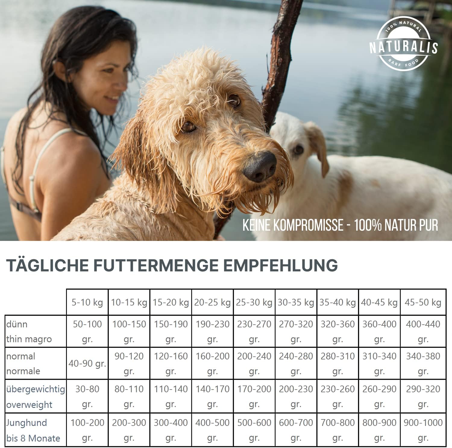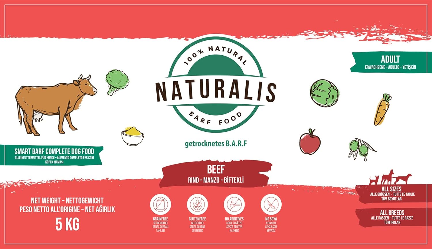 - GÜNSTIG UND GESUND - Naturalis Trockenbarf ist günstig! 5kg Naturalis Smart 80 Trockenbarf Rind reicht 35 Tage für die Ernährung eines mittelgrossen Hundes von ca. 17,5 kg (140g pro Tag)..
