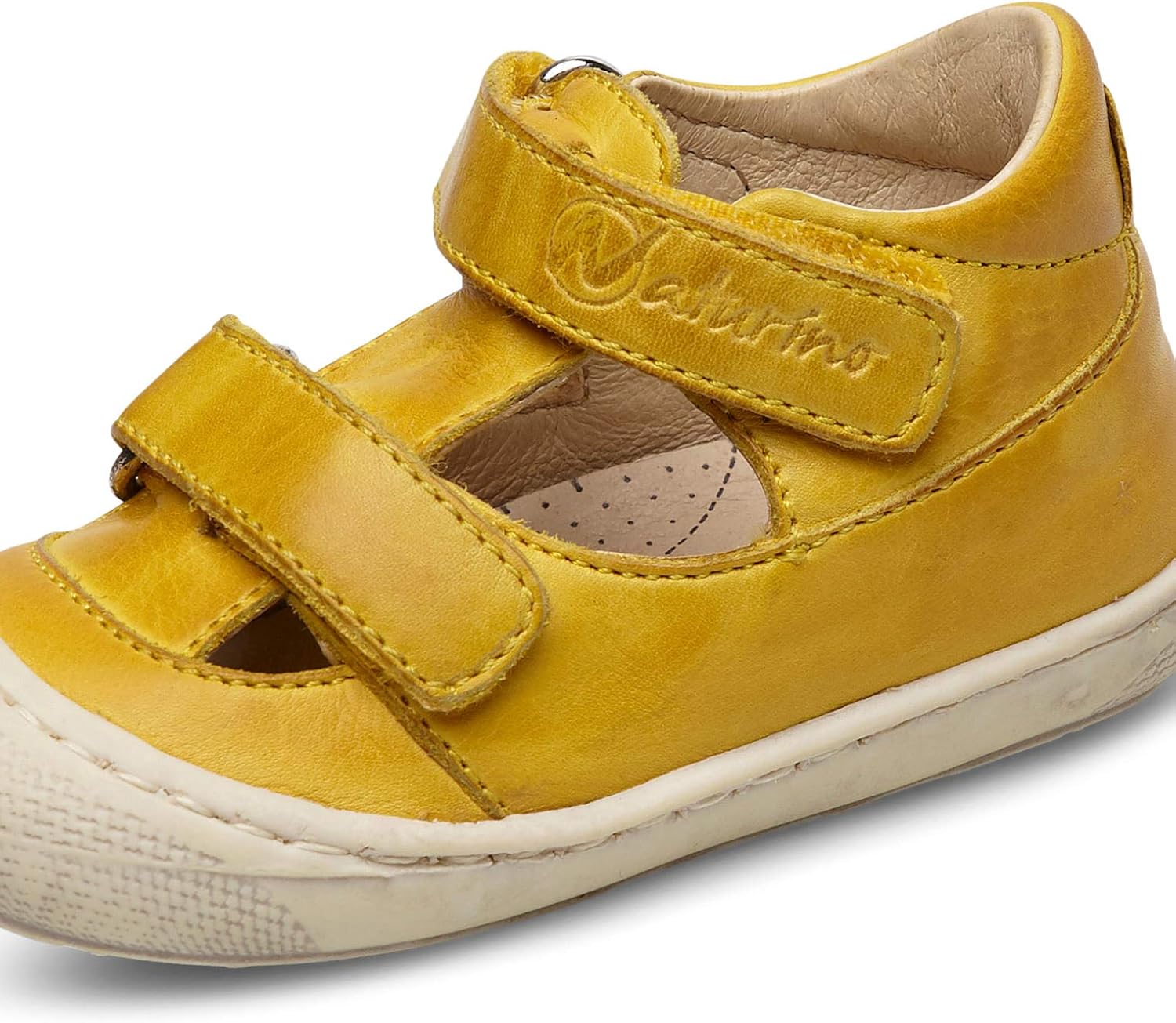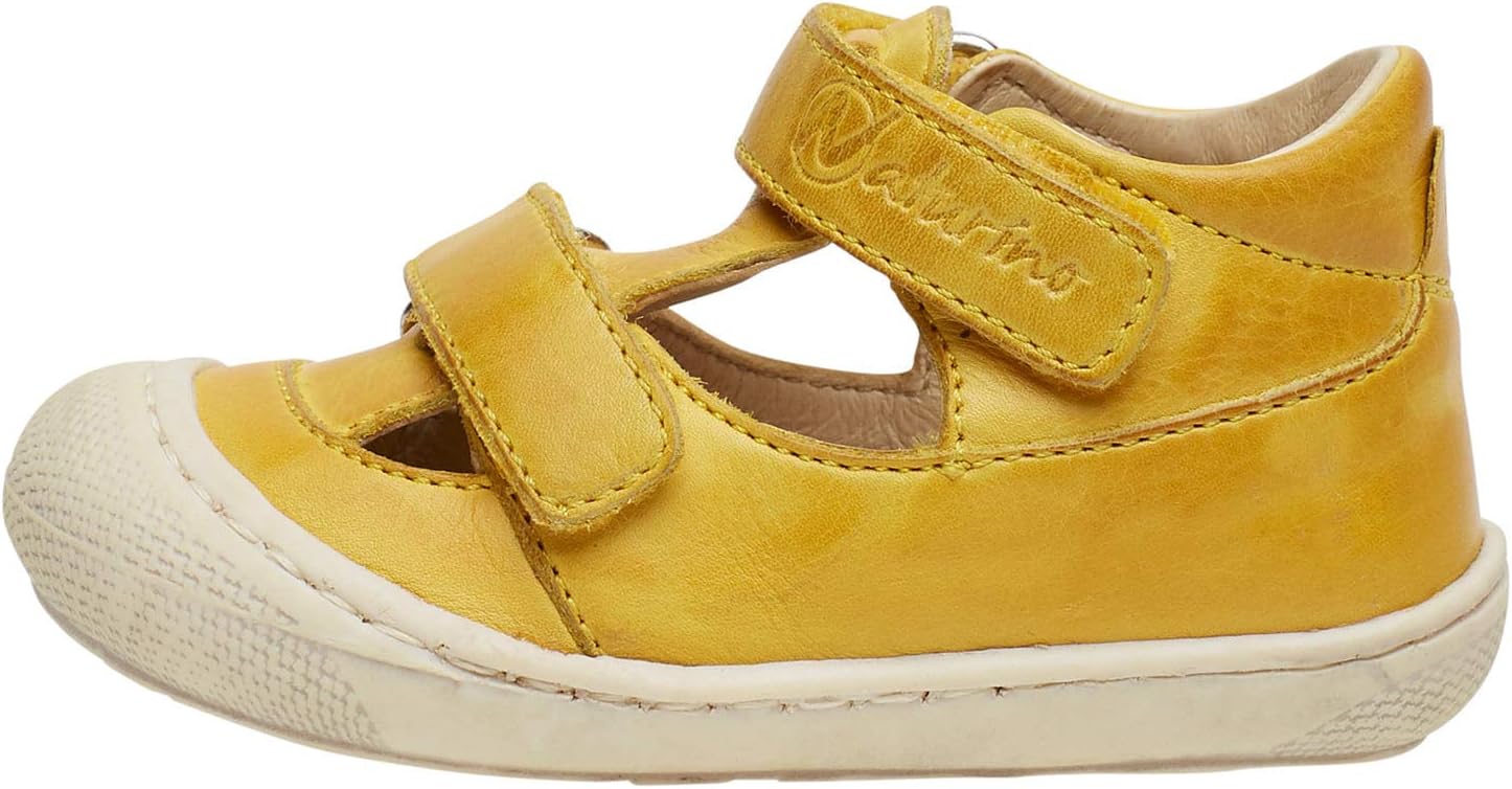 PRODUKTBESCHREIBUNGEN Halboffener Schuh aus gelbem Nappaleder mit verstärkter runder Zehe, Doppelverschluss und T-Riemen. Flexibler und leichter Gummiboden, Lederfutter und herausnehmbare Innensohle.