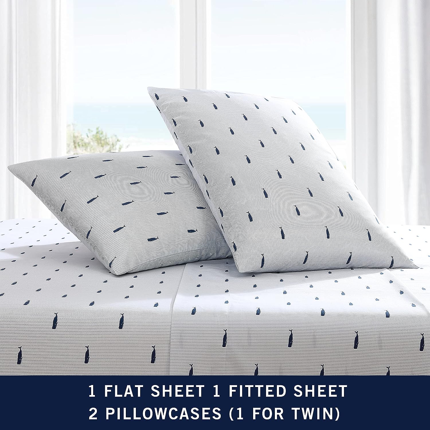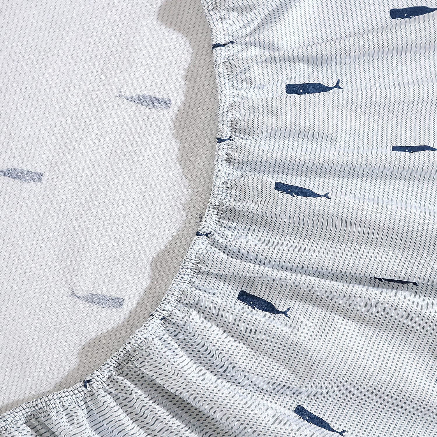 - Farbe und Haptik: Einlagiges Blatt - leicht und doch langlebig; die Fäden sind eng gewebt, um eine Glätte auf allen Sets zu gewährleisten. Das gestreifte Bettlaken-Set von Nautica Wal verfügt über ein dunkelblaues Wal-Motiv mit