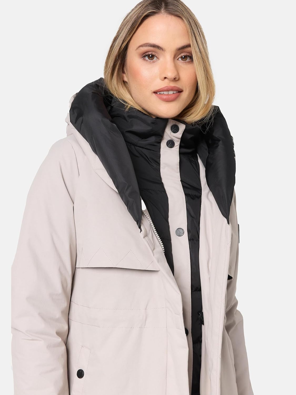 - LOOK: Stylischer Damen Wintermantel mit kontrastfarbenen Elementen, hohem Kragen und grosser gefütterter Kapuze von der Marke Navahoo - der perfekte Begleiter an kalten Tagen im Herbst und im Winter!