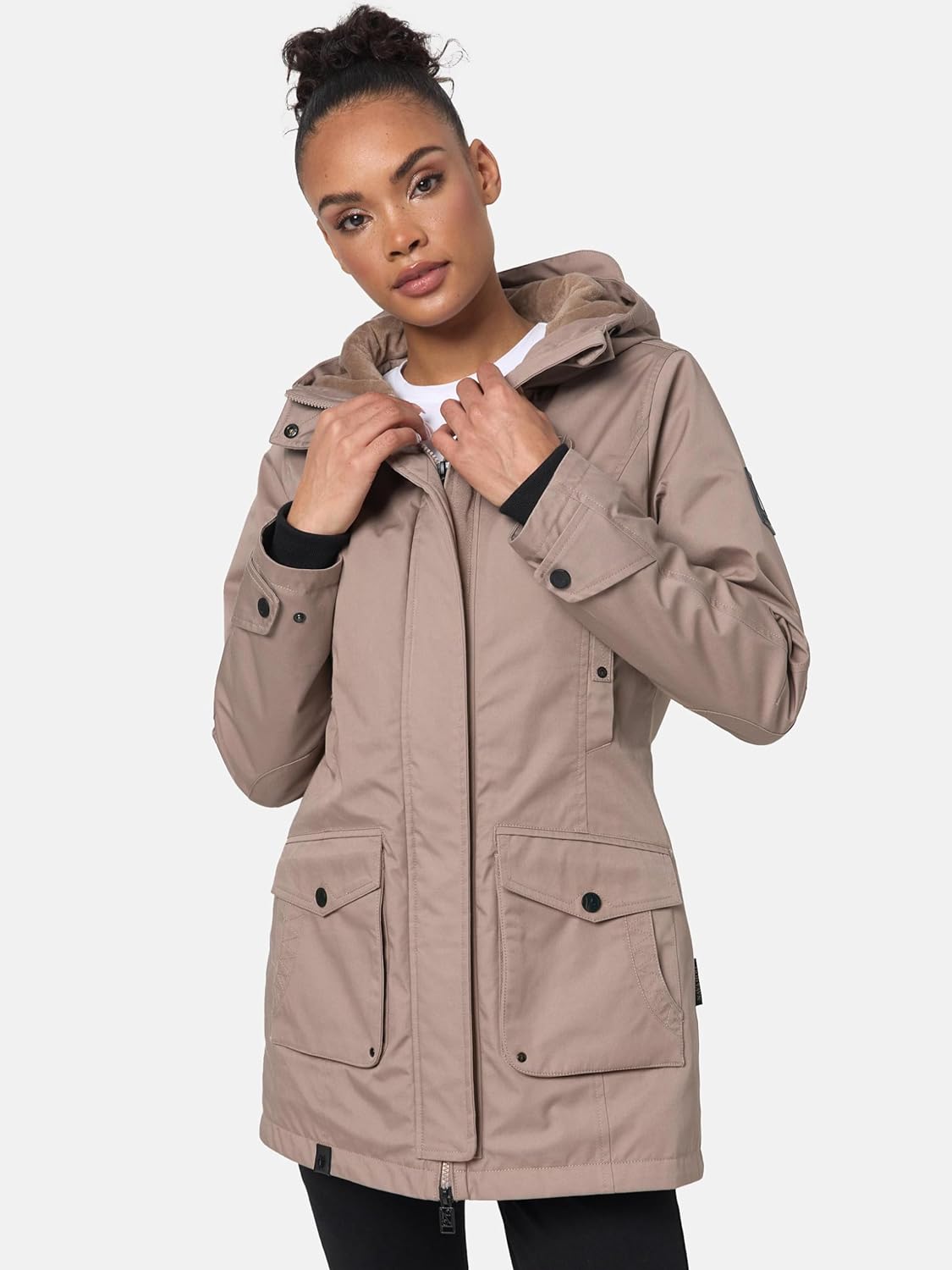 - PASSFORM: Kurzer Parka mit tailliertem Schnitt, super Länge bis über den Po (hinten länger geschnitten), dank Gehschlitz hinten trotzdem genug Bewegungsfreiheit, die Kapuze ist individuell in der Weite verstellbar und die Ärmelenden können durch