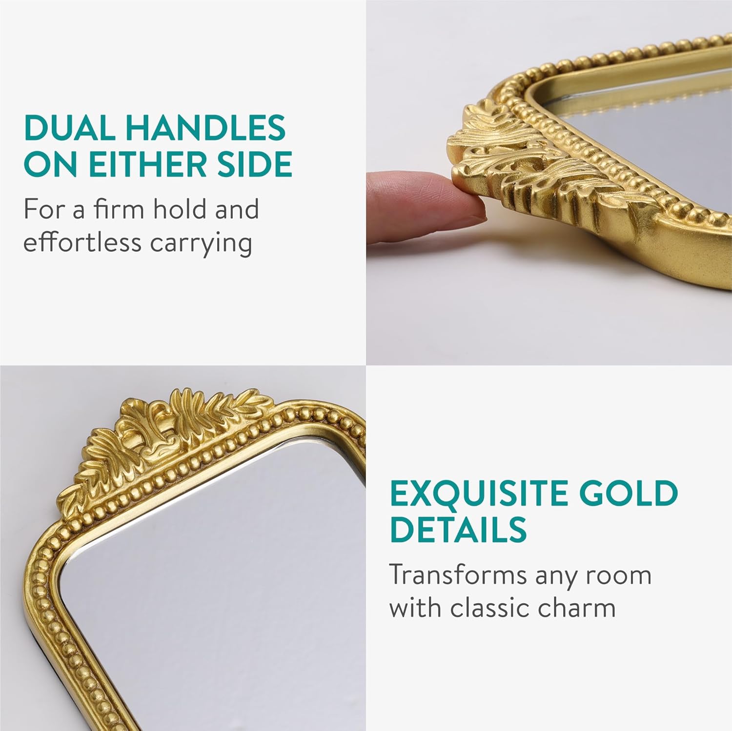 - Praktisches Serviertablett: Dank der Griffe an beiden Seiten lässt sich dieses goldene Tablett leicht von Raum zu Raum tragen. Es ist ideal als Serviertablett für Gläser oder als stilvolles Deko Spiegeltablett.