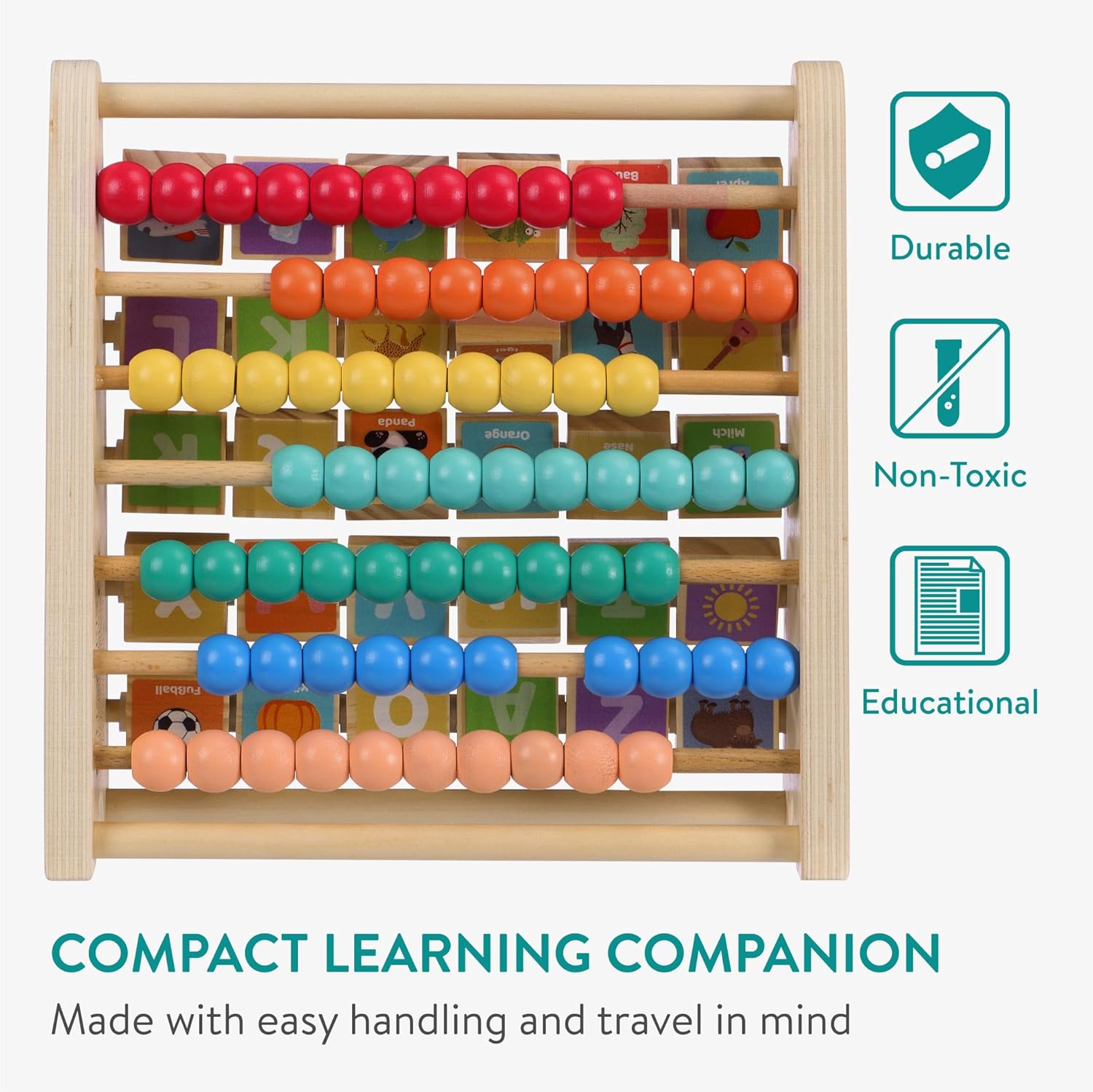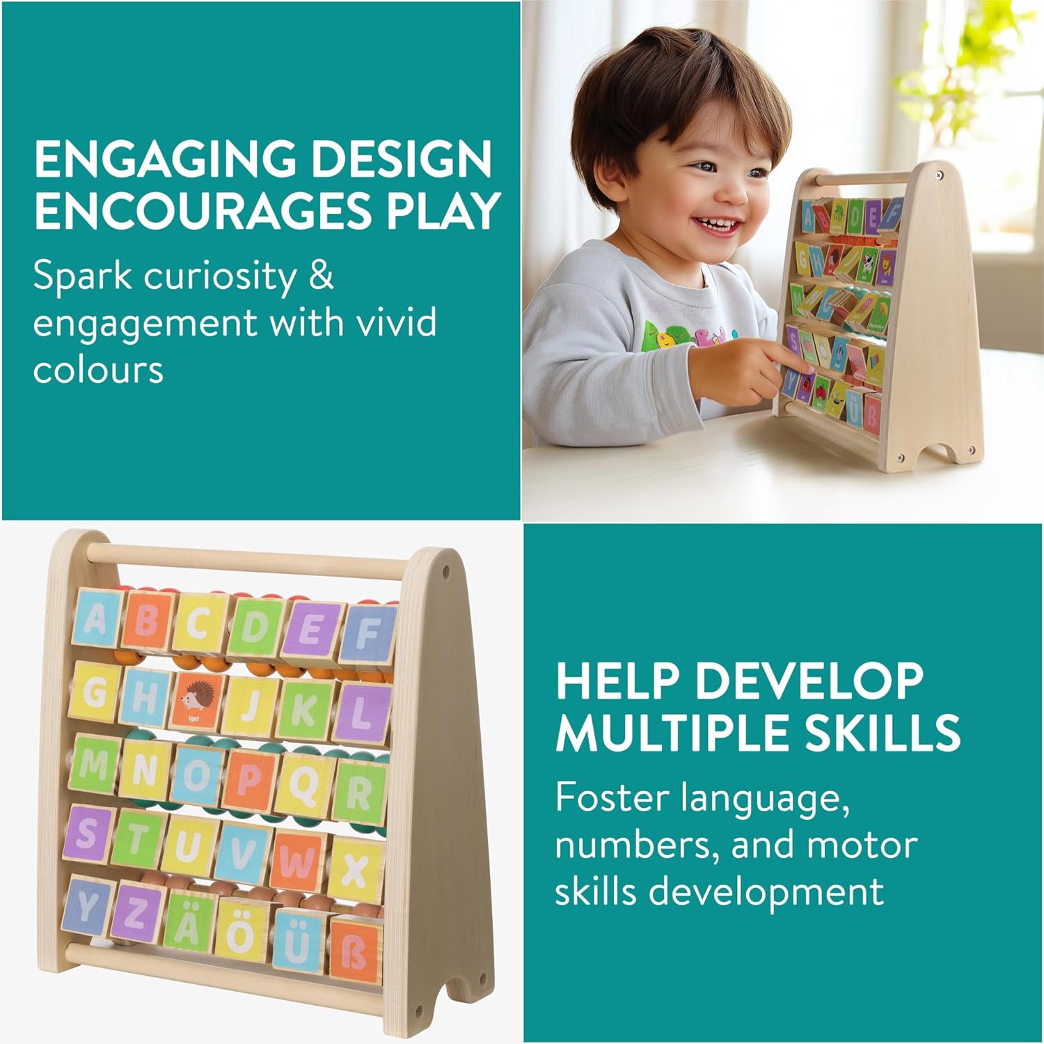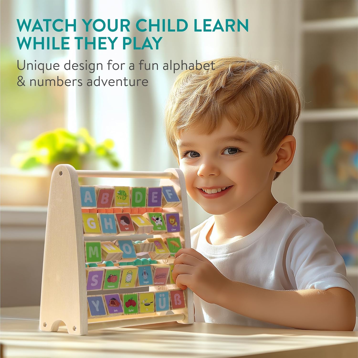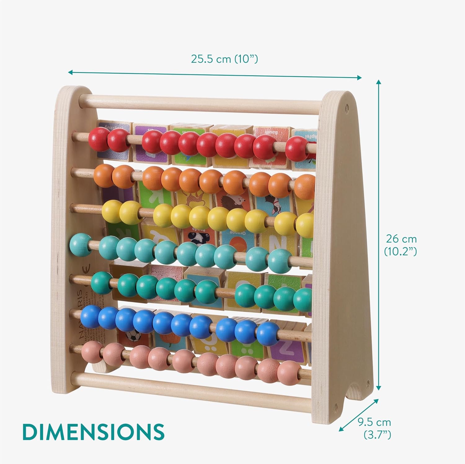 - Rechnen lernen: Auf der anderen Seite befindet sich ein farbenfrohes Rechenbrett. Dies hilft Kindern, Zahlen und einfache Mathematik zu lernen, während sie gleichzeitig ihre feinmotorischen Fähigkeiten entwickeln.