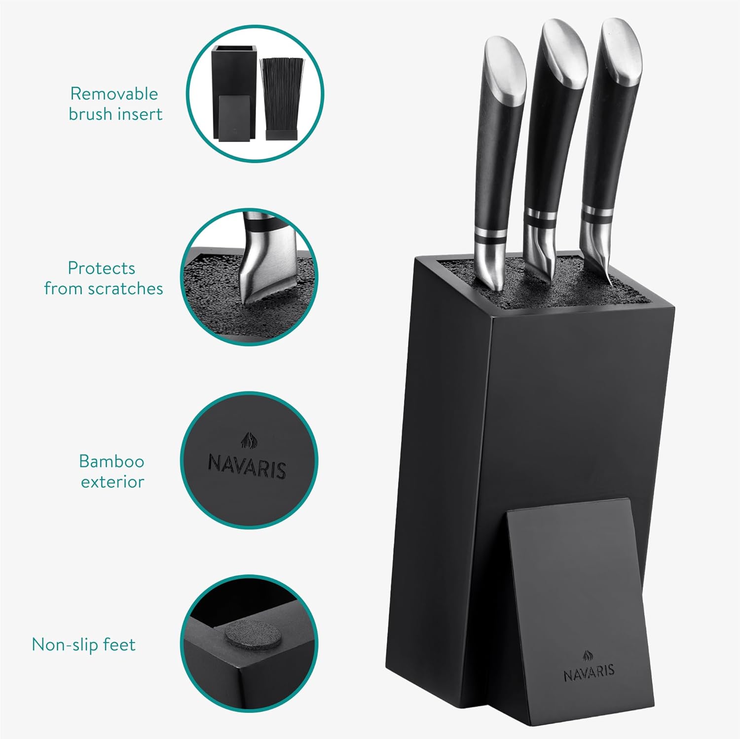 - DETAILS: 1x Küchenmesserblock aus Bambus geneigt, leer / Abmasse: 25 x 15 x 10,5 cm / mit Borsteneinsatz aus Kunststoff / rutschfester und stabiler Stand dank EVA Pads am Boden / Gewicht: 1,9 kg