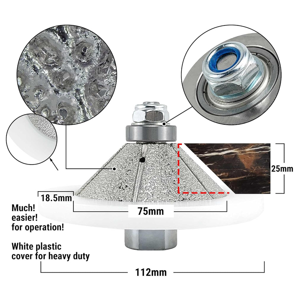 - 1 Stück E25 (Schrägfläche, E25 x 75 mm) NBB VB Diamantprofilräder (Diamantfräser) in professioneller Qualität mit M14-Anschluss, einfach an Winkelschleifer anzuschliessen (Standardanschluss in Europa und Grossbritannien).