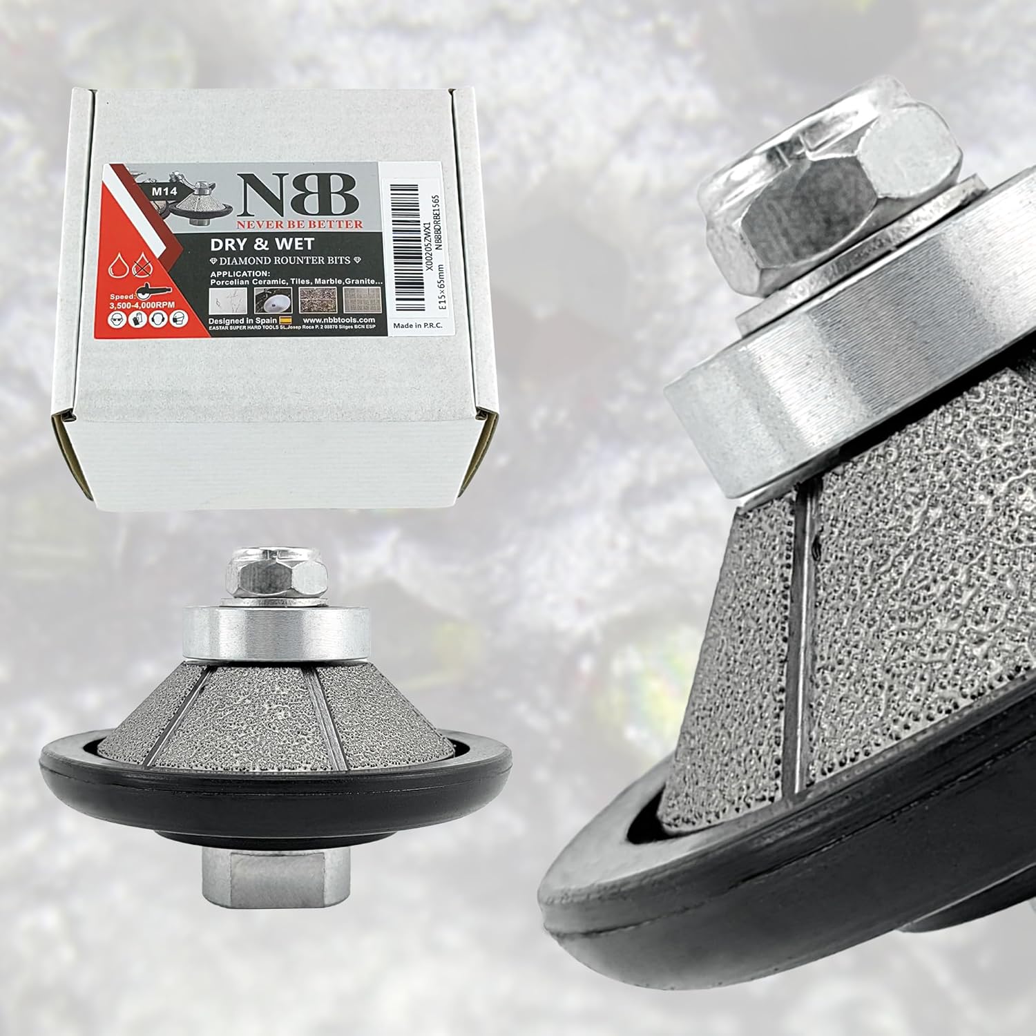 - 1 Stück E15 (Schrägfläche, E15 x 65 mm) NBB VB Diamantprofilräder (Diamantfräser) in professioneller Qualität mit M14-Anschluss, einfach an Winkelschleifer anzuschliessen (Standardanschluss in Europa und Grossbritannien).