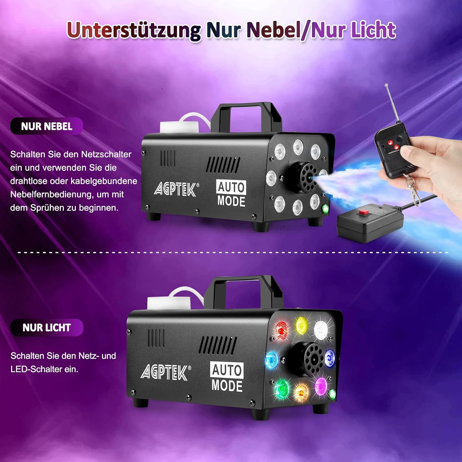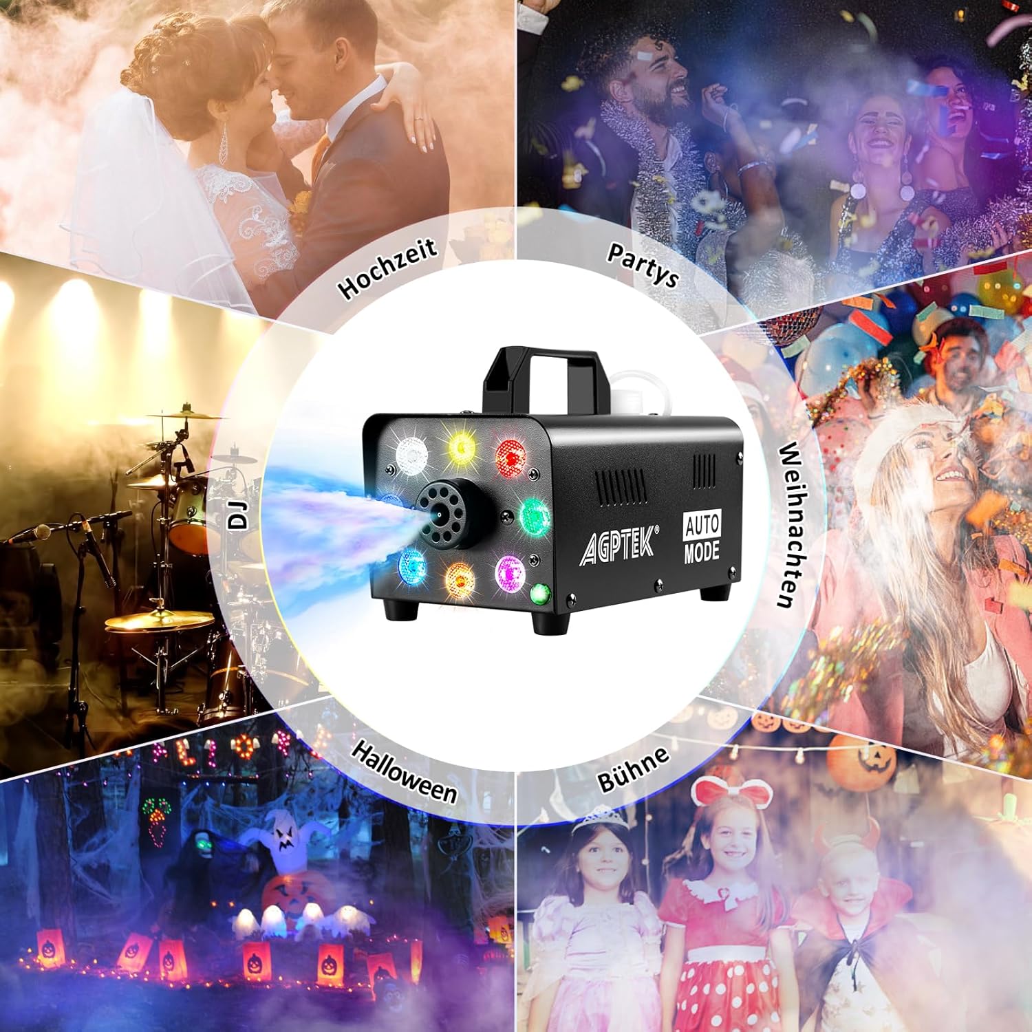 - 【LED-LICHTDESIGN】: Es kommt mit einem aktivierten LED Lichtern und kann nur so die Festivalatmosphäre verbessern und die Menschen vor allem bei der Trauung romantisch fühlen. Bitte beachten Sie, dass das LED-Licht leuchtet, während die Nebelmaschine arbeitet.