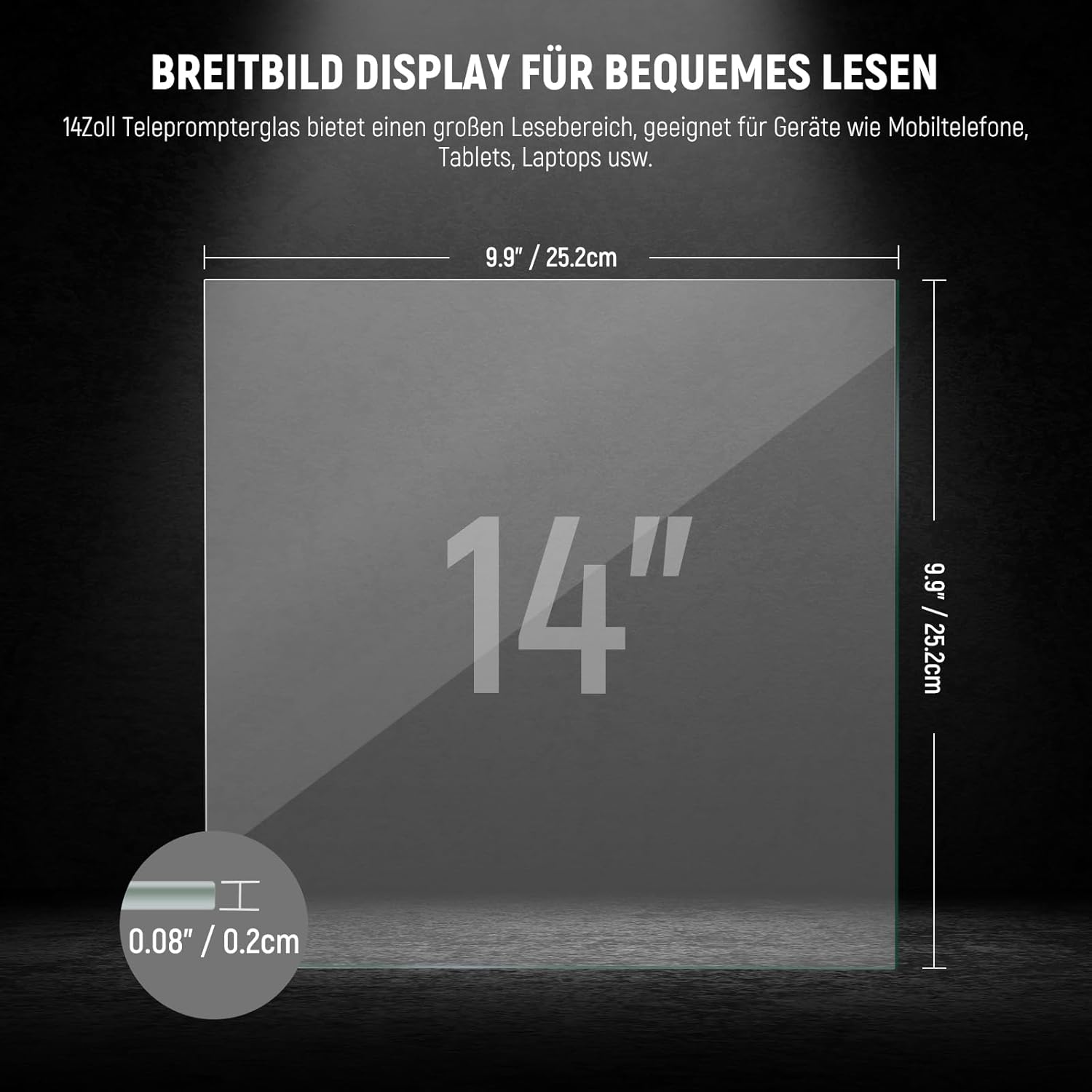• 【14" Displayglas für grösseren Lesebereich】 Dieses 9,9"x9,9"/25,2x25,2cm Teleprompter Ersatzglas bietet einen 14" Bildschirm für eine breite Skriptabdeckung, sodass Sie mehr Informationen gleichzeitig kontinuierlich lesen können. Es erfüllt die