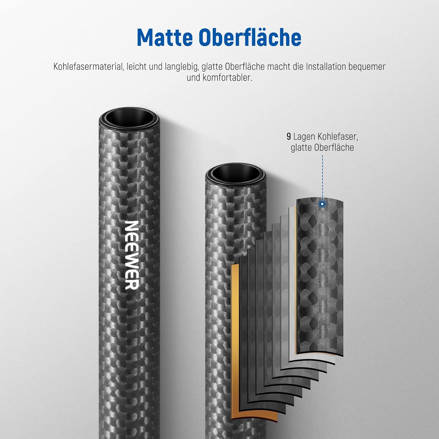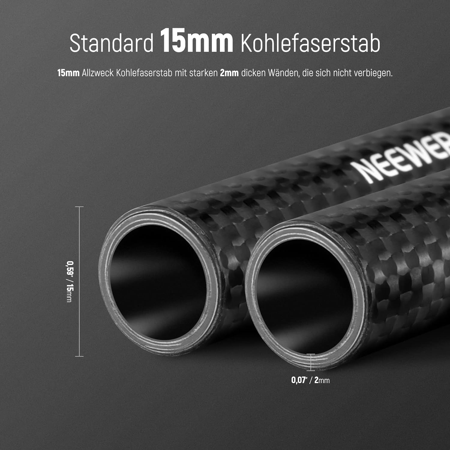 - 【15mm Stäbe aus Kohlefaser】 Diese 15mm Stäbe bestehen aus 9 Lagen Kohlefaser und sind beständig gegen Korrosion, Stösse, Biegung und hohe Hitze, ideal für die Videoproduktion im Innen- und Aussenbereich. Matte Oberflächen eliminieren ausserdem