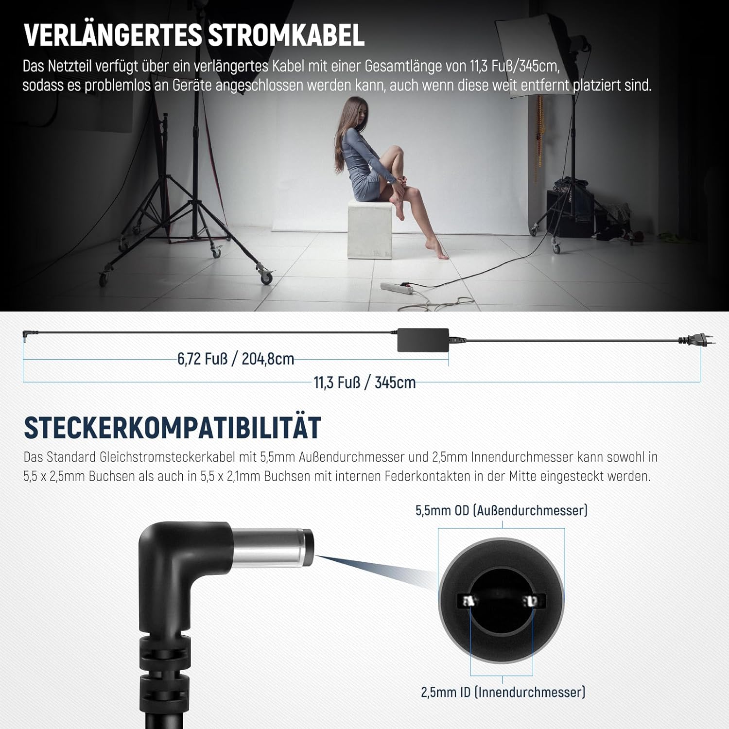 - 【Erweiterte Kabel und Steckerkompatibilität】 Das Netzteil und das Kabel verfügen über eine Gesamtkabellänge von 11,3 Fuss/345cm, sodass der Anschluss an Geräte auch dann einfach ist, wenn diese weit entfernt platziert sind. Darüber hinaus kann
