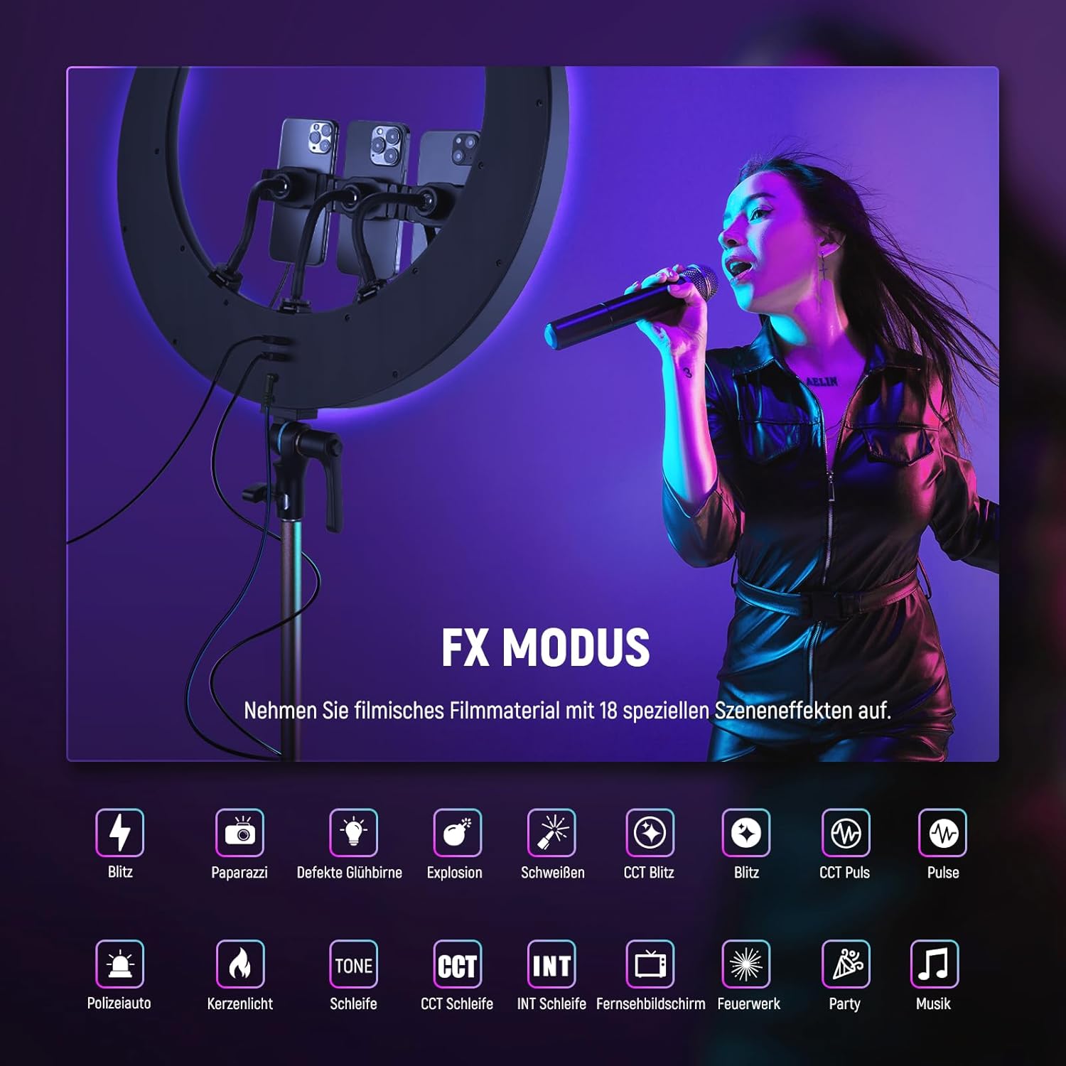 - 【Vielseitiges 19" RGB LED Ringleuchte】RP19C ist ein 19" grosses RGB Ring Licht für Make up, Live Streaming, Zoom Anrufe, Videokonferenzen und Selfies. Mit 864 LEDs, 42W Leistung, 0-100% Dimmung, 2800Lux/0,5m Beleuchtungsstärke, CRI 97+ und einer