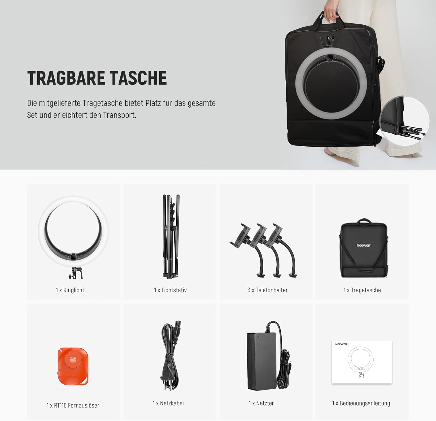 - 【Touchpanel/APP/2,4G Steuerung】RP19C Ringlampe verfügt über ein Touchpanel, mit dem Sie ganz einfach den gewünschten Effekt erzielen können. Laden Sie unsere kostenlose NEEWER App auf Ihr Mobiltelefon herunter, um die Beleuchtung per Funk zu