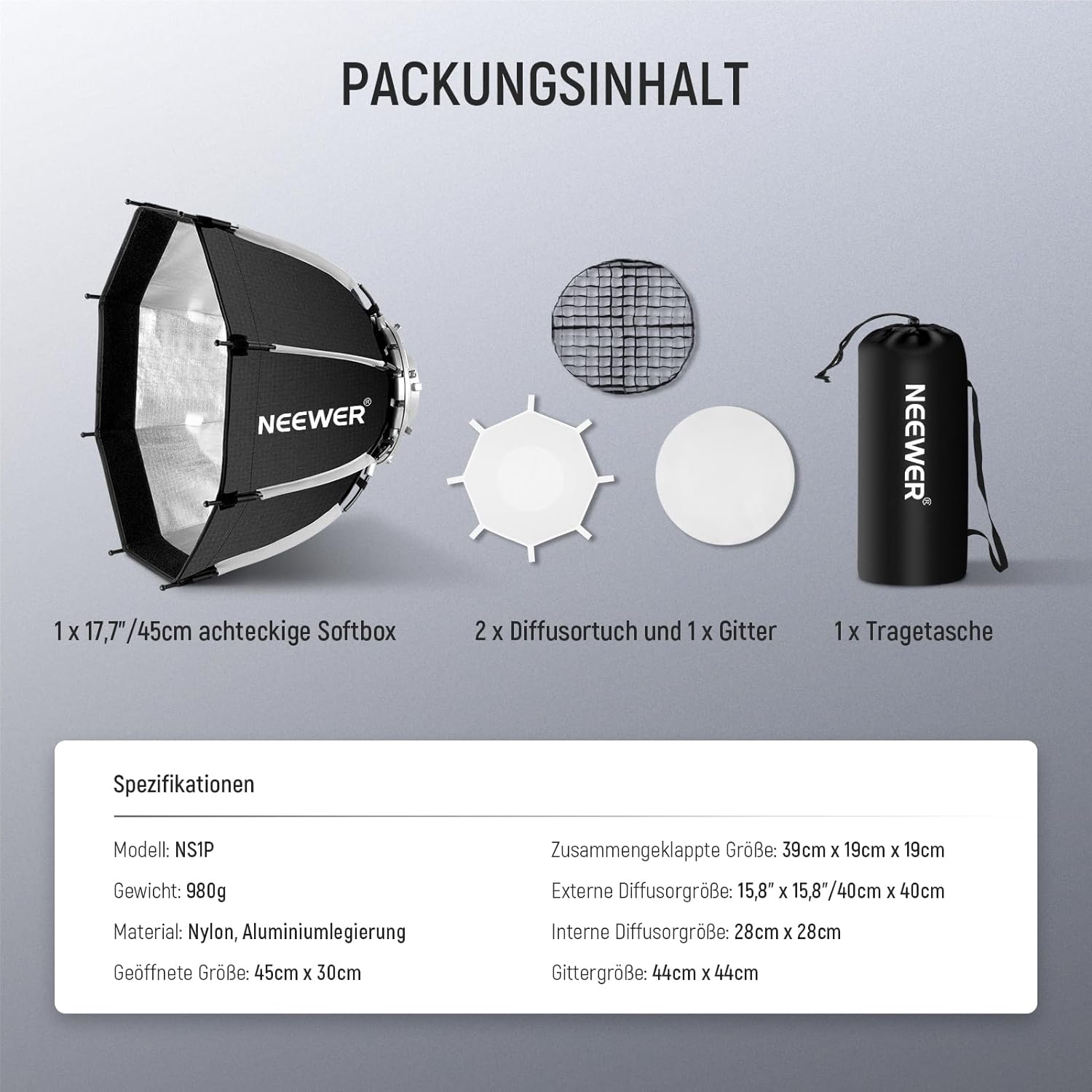 NEEWER 45cm Octagon Softbox Bowens Halterung, Schnellverschluss Achteckige Softbox, Diffusoren/Waben