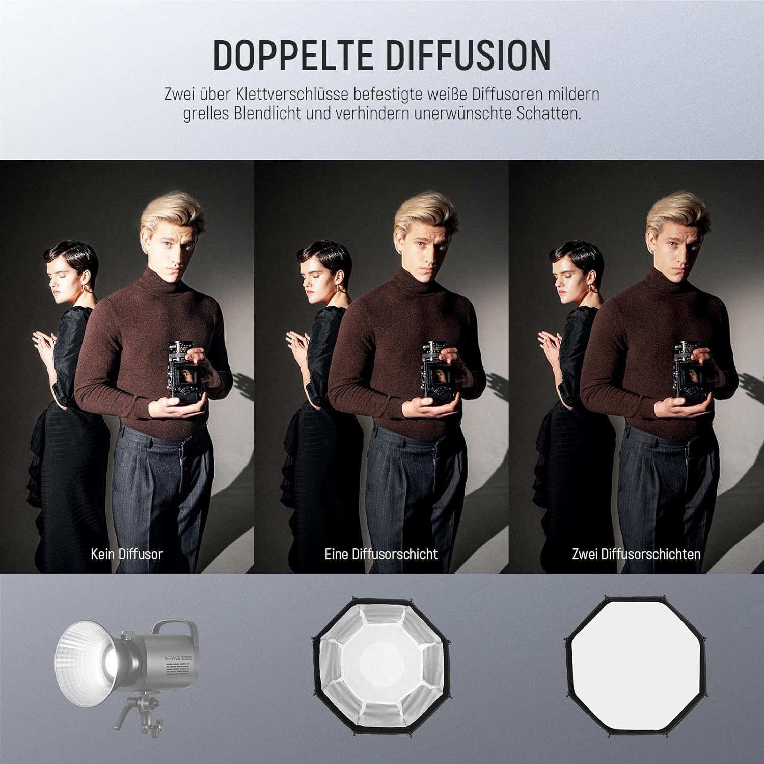 • 【Wabengitter und Diffusoren】 Die internen und externen Diffusoren können für ein noch weicheres und diffuseres Licht kombiniert werden und können zur einfachen Montage über Klettverschlüsse befestigt werden. Das Wabengitter lenkt das Licht im