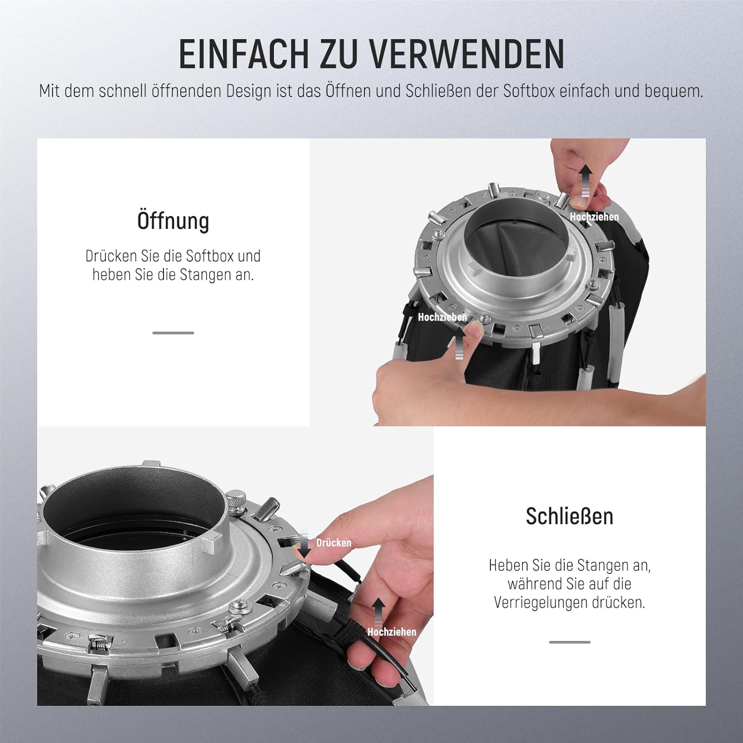 • 【Schnelles Zusammenklappen und externe Rippen】Ziehen Sie die Rippen nach oben, um diese Softbox in Sekundenschnelle zu entfalten und zu verriegeln, und halten Sie dann einfach die Schnellentriegelungsknöpfe gedrückt, um sie zusammenzuklappen. 8