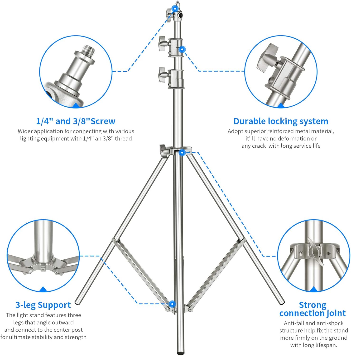 - 【Solide Konstruktion】 Hergestellt aus 100% robustem Edelstahl, ist das Lichtstativ beeindruckend langlebig und resistent gegen Korrosion und Feuchtigkeit für Aussenaufnahmen