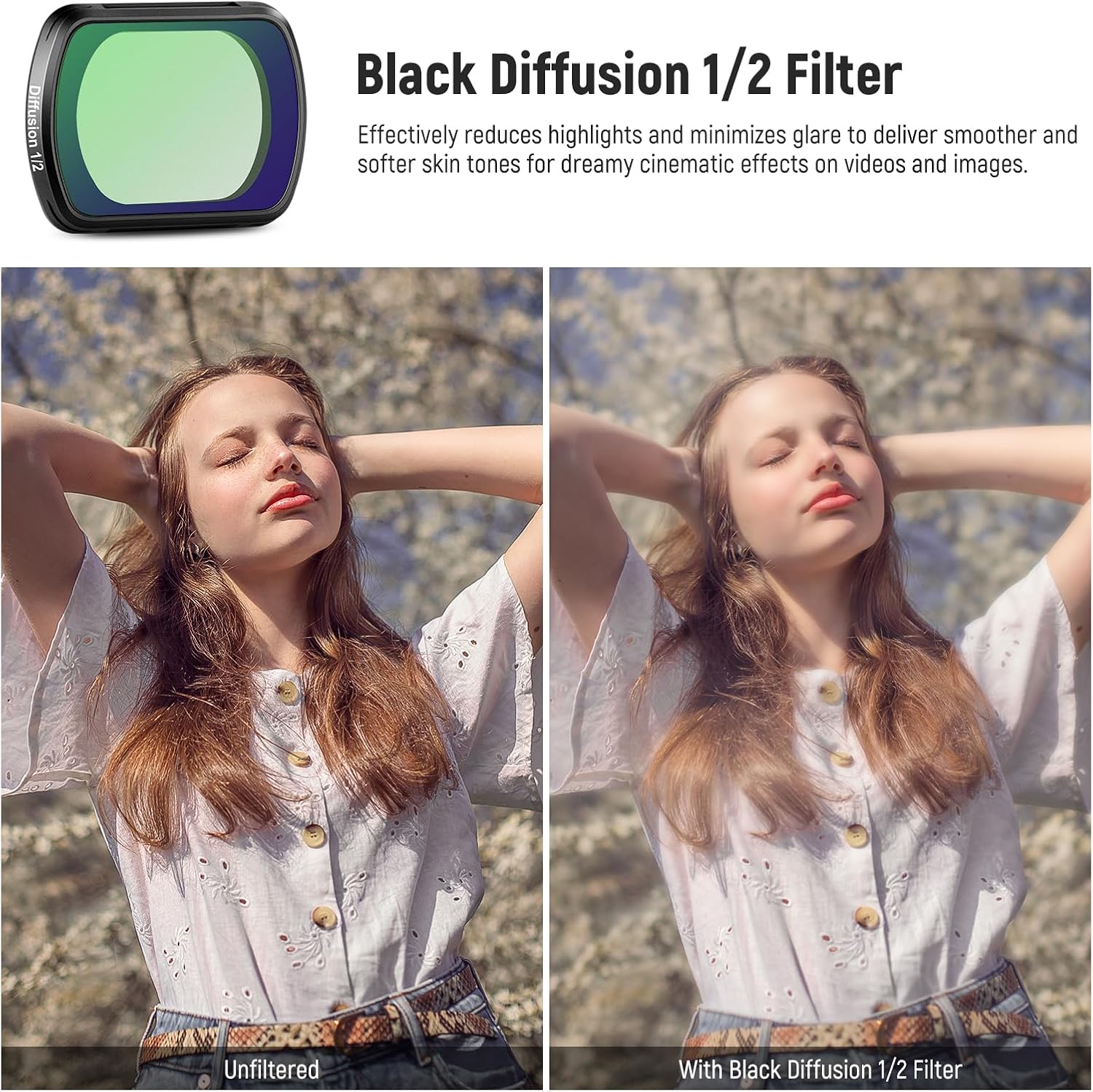 - 【Verträumter Kinoeffekt】 Der Black Diffusion 1/2 Effektfilter mildert Glanzlichter und reduziert Blendeffekte, wodurch ein unscharfer, verträumter Effekt entsteht, der die filmische Qualität des Bildes verstärkt und sich perfekt für die