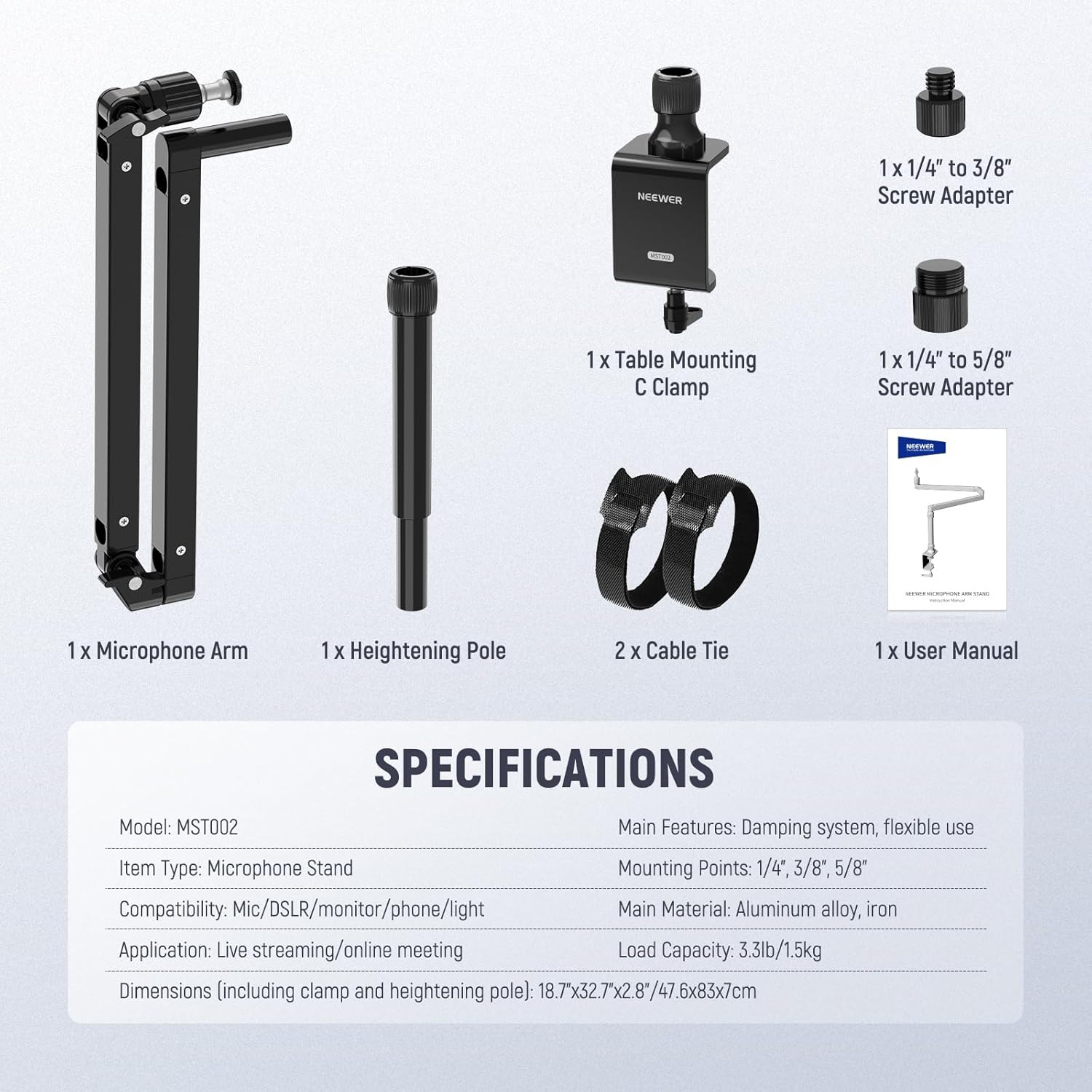 - 【Niedriger Mikrofon Arm zur Tischmontage mit Dämpfung】 Der aus Aluminiumlegierung gefertigte Mikrofonständer verfügt über zwei Gelenkarme und eine Supergriff C Klemme für Tisch mit Dicke von 0,8"-2,7", die Mikrofon bei maximalen Belastung von