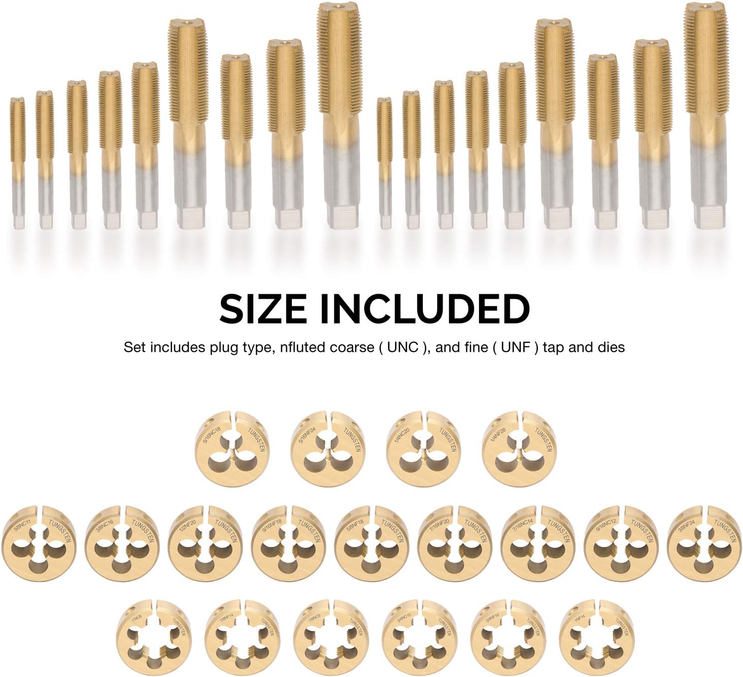 • 10 UNC Wasserhähne Grösse: 1/4–20, 5/16–18, 3/8–16, 7/16–14, 1/2, 13, 9/16–12, 5/8–11, 3/4–10, 7/8–9,1–8