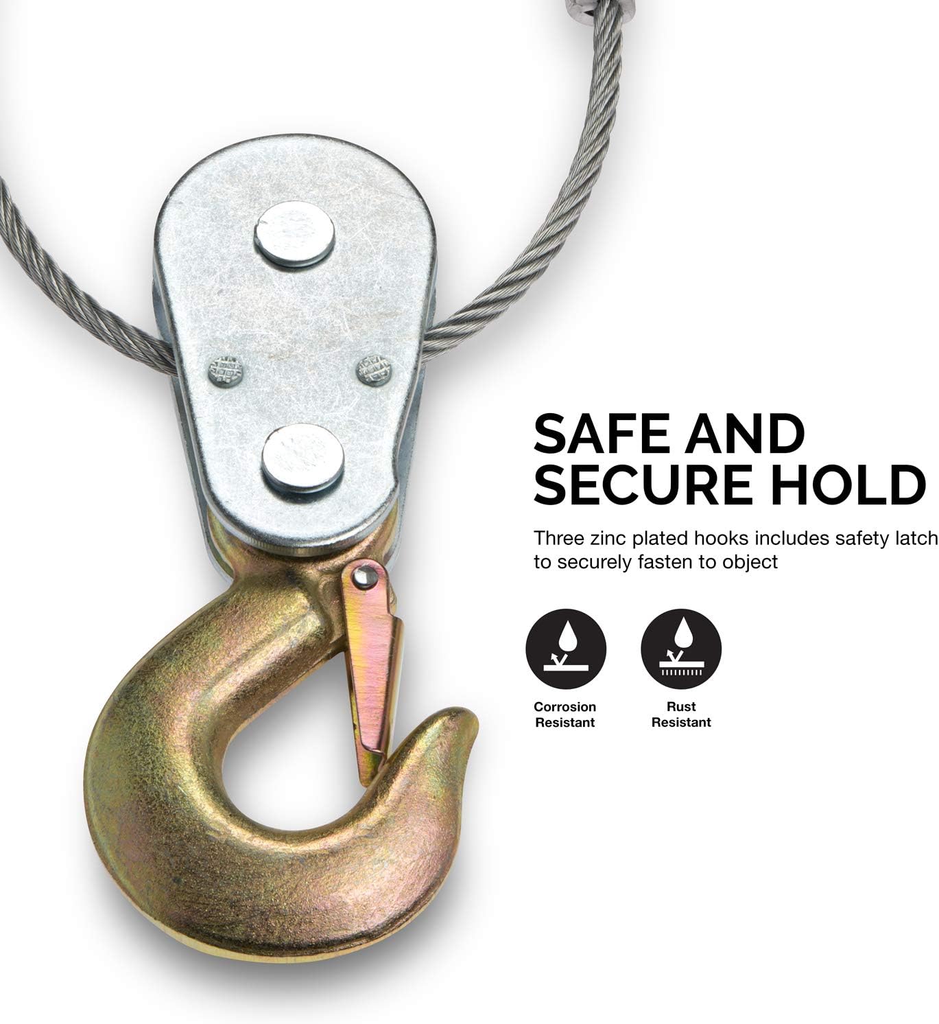 - Windhaken: Robuste Abzieher-Stahlkonstruktion für zusätzliche Haltbarkeit; Haken und Getriebe sind verzinkt für eine lange Lebensdauer in Ihrer Garage oder Werkstatt beim Ziehen, Ziehen, Heben oder Dehnen. Sicherheitsriegel an allen Haken, um Unfälle