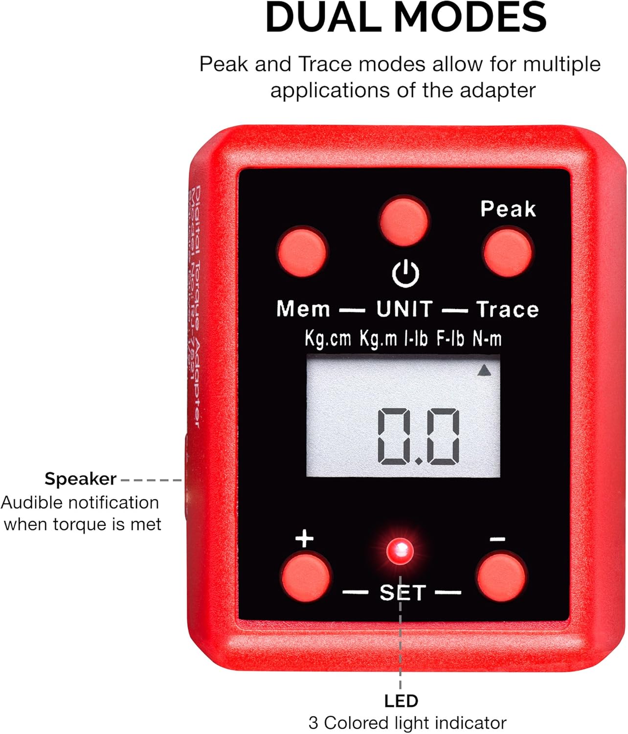 • 【Peak and Trace-Modus】 Diese Drehmomentadaptereinheit bietet zwei Arten von Modi: einen Spitzenmodus, der anzeigt, wann ein bestimmtes Drehmomentniveau erreicht ist, und einen Trace-Modus, der aktiv anzeigt, wie viel Drehmoment auf dem Display