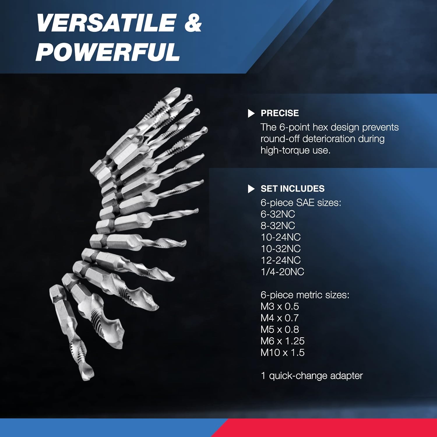 - 1/4-Zoll-Sechskantschaft: Jeder Bit verfügt über einen praktischen 1/4-Zoll-Sechskantschaft mit einem konischen Ende, um Überschneiden zu verhindern und übergrosse Löcher zu minimieren. Dieses Gewindebohrerset beinhaltet auch einen
