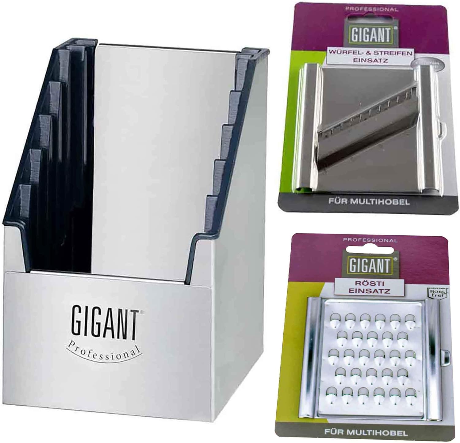 PRODUKTBESCHREIBUNGEN Multi-Box für 4-fach Hobel Gigant mit 2 Einsätzen, 1 Einsatz zum Reiben von Rösti und Würfel-und Streifen Die ideale Box zur Aufbewahrung ihres Multi 4-fach Hobel von Gigant. Endlich mal ordnen sie ihren Hobel mit all seinen Einsätzen immer am festen Platz in Ihrer Küche an. Griffbereit und immer im Einsatz wenn gehobelt und dekoriert wird. Die Box mit den Einsätzen steht immer rutschfest auf ihrer Arbeitsfläche und bietet Platz bis zu 6 Einsätzen. Erhalten sie mit diesem Set gleich 2 schöne zusätzliche Einsätze für Ihren 4-fach Hobel Rösti Einsatz, Würfel- und Streifenschnitt