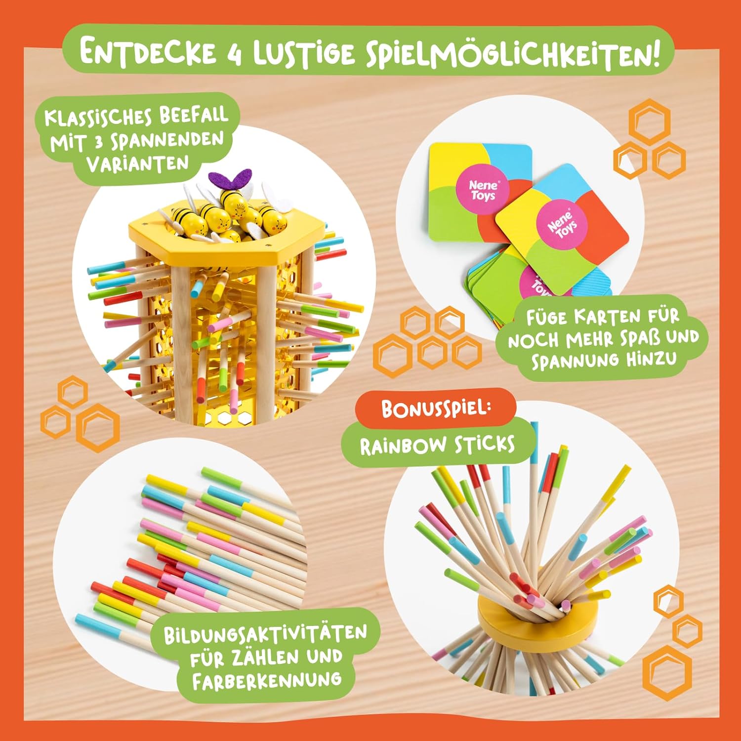 - đ SICHERHEIT UND HALTBARKEIT AN ERSTER STELLE: BeeFall ist aus hochwertigem, ungiftigem Holz gefertigt und fĂŒr langlebiges und sicheres Spielen konzipiert. Die robusten Komponenten wie der Holz-Bienenstock, die bunten StĂ€be und die niedlichen Bienen