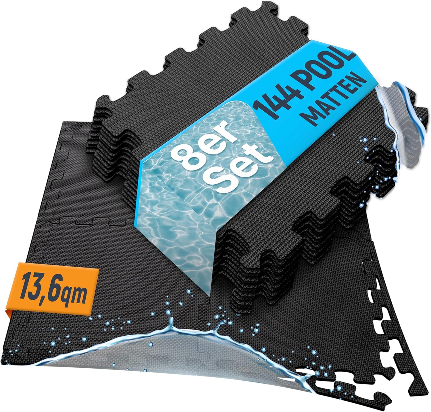 • 🧩 Du erhältst 8 Sets mit 18 Pool Matten Untergrund und 27 Randstücken (insgesamt 144 Matten) und kannst eine Fläche von 13,6 m² auslegen. Ob du quadratisch oder länglich auslegst: Dank der Puzzletechnik ist der Pool Matten Untergrund endlos