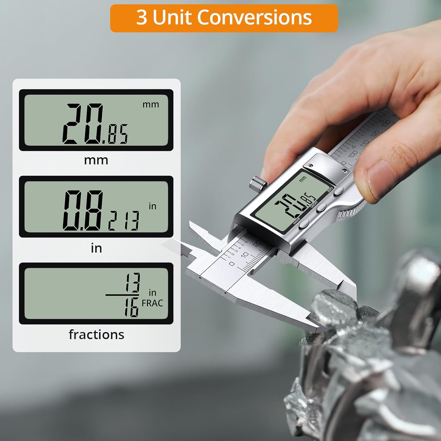 - Drei Messmodi: ein digitaler Messschieber aus Edelstahl mit höherer Qualität mit drei Umrechnungsmessmodi: Zoll / Metrik / Bruchteil
