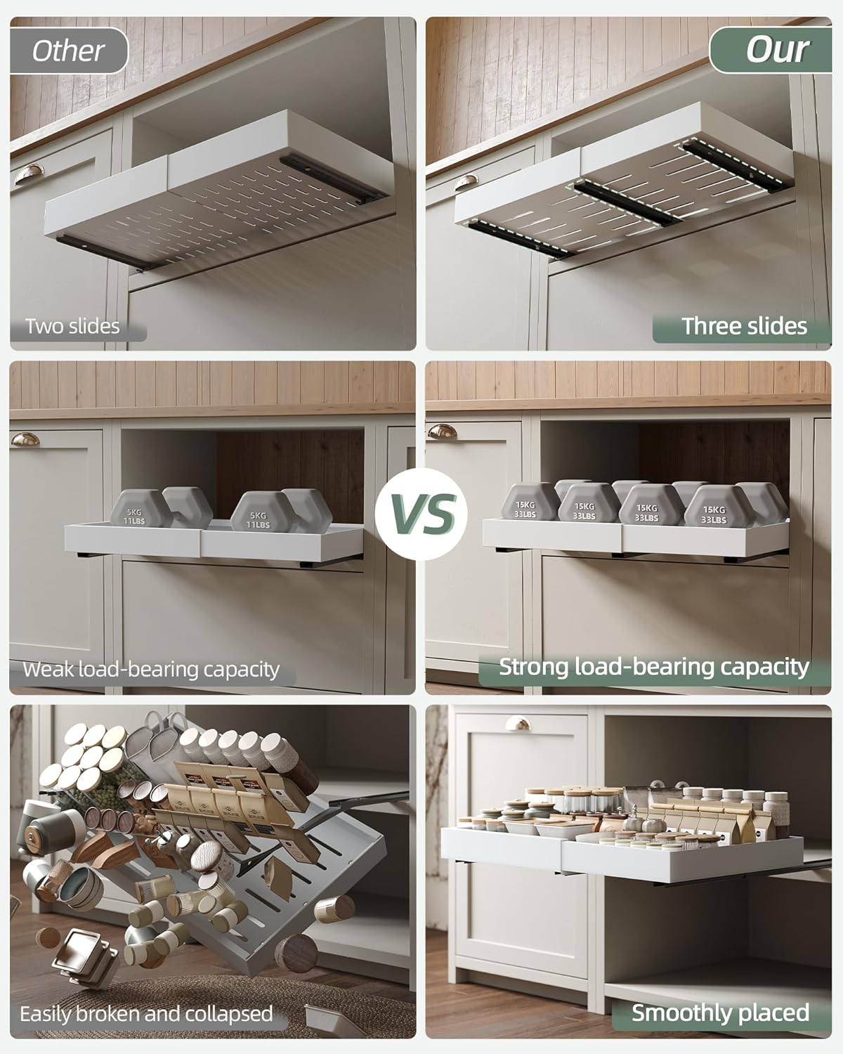 - 【GLATTES UND LEISES GLEITEN】Der ausziehbare Schrankorganisator ist mit dämpfenden Schienen entworfen, die auch nach 40.000 Mal Öffnen und Schliessen noch glatt gleiten können, und einteilige glatte Schienen, um die Reibung zu reduzieren und ohne