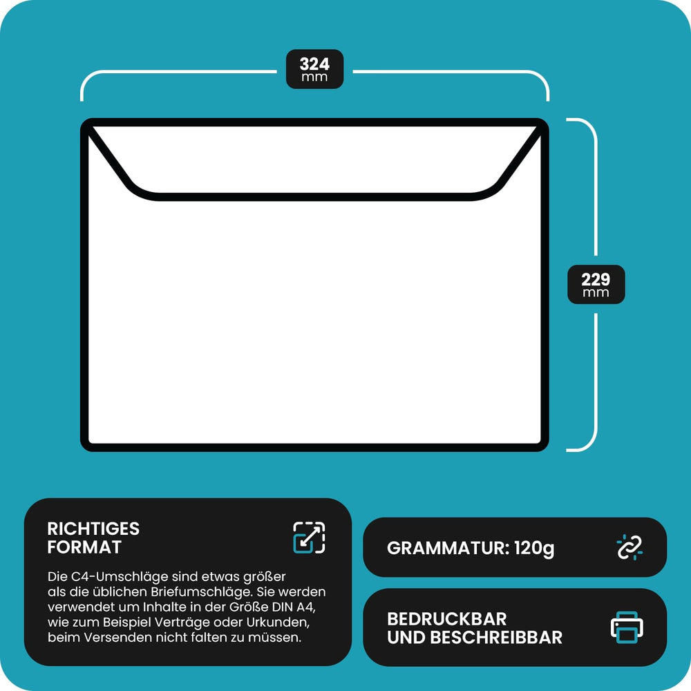 - RICHTIGES FORMAT – Die C4-Umschläge (229 x 324 mm) sind etwas grösser als die üblichen Briefumschläge. Sie werden verwendet um Inhalte in der Grösse DIN A4, wie zum Beispiel Verträge, Zeugnisse oder Urkunden, beim Versenden nicht falten zu