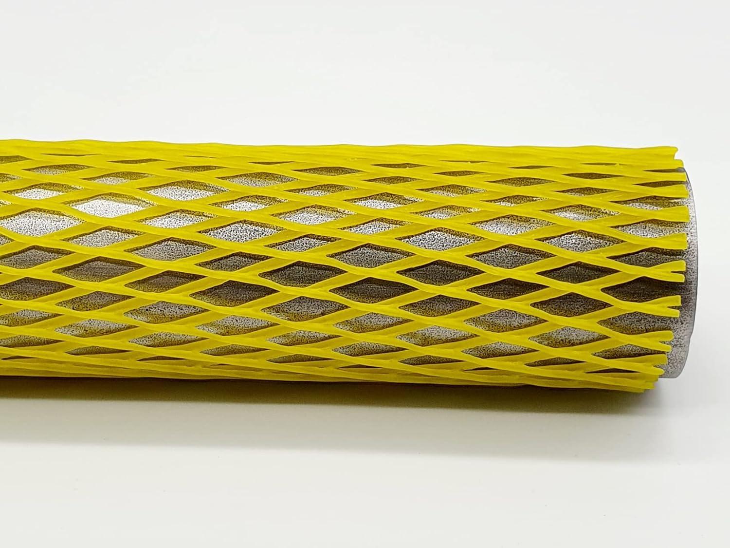 - Ein Oberflächenschutznetz dank seiner Federfähigkeit wickelt sich um das Produkt und verhindert eine Einwirkung von Aussen auf das Produkt.