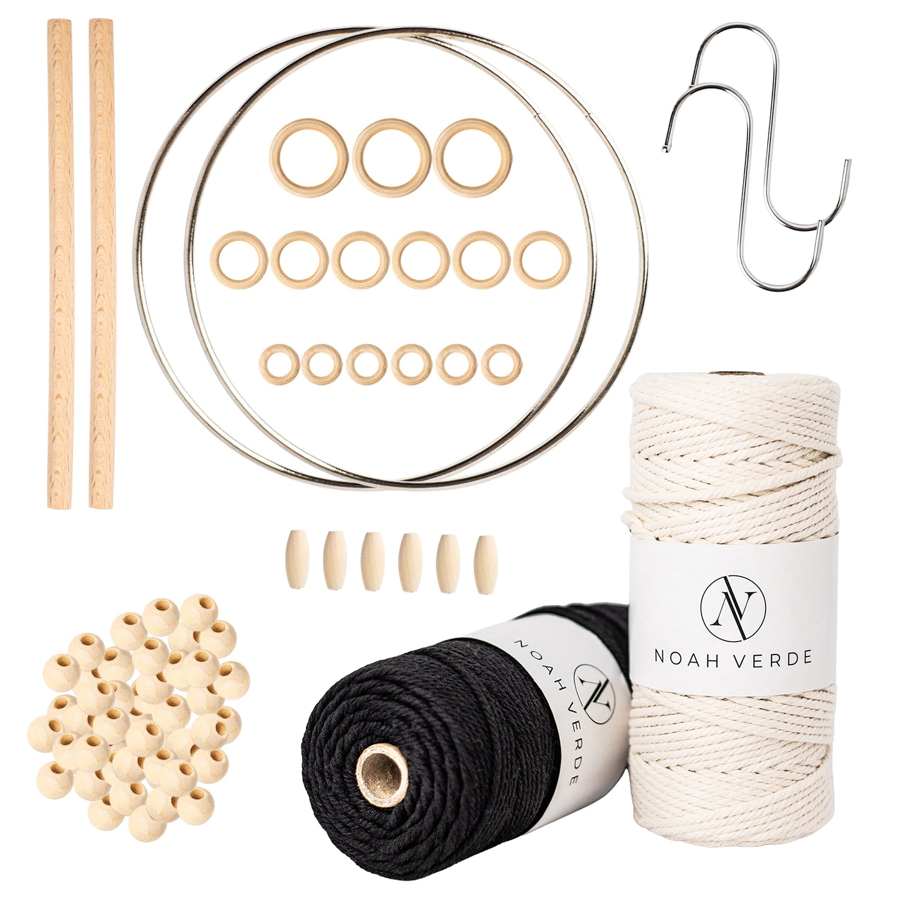 - 🪢 [Makramee Zubehör] Unser DIY Set enthält 2x Macrame Cord in Natur & Schwarz (3mm x 100m), 2 Metallringe zum Basteln (12cm), 2 Haken silber (9,5cm), 2 Holzstäbe (15cm), 15 Holzringe (2,3,5cm), 50 Holzperlen natur (1cm), 6 Perlen aus Holz oval