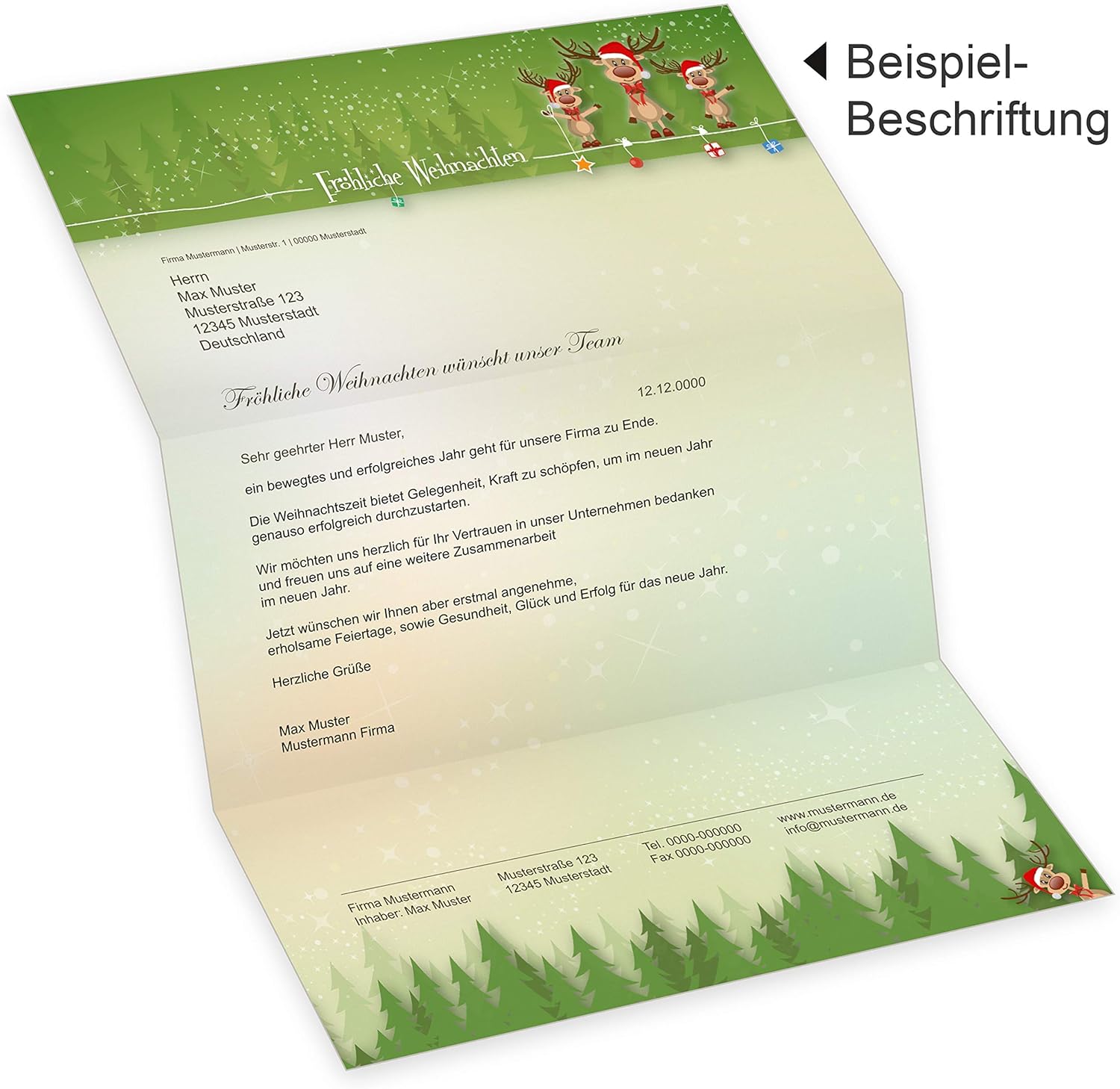 - INHALT: 25 Blatt Briefpapier DIN A4 + 25 Umschläge DIN lang für Weihnachten, Schönes Motiv: "Lustige Rentiere" Grün