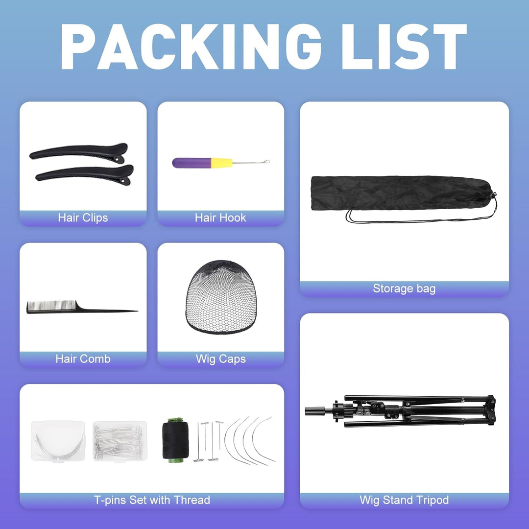 - 【Paket enthalten 】1 x Perückenständer Stativ, 1 x Styling Kamm, 1 x T-Pins Set, 1 x Perückenkappe, 1 x Haken, 2 x Haarspangen