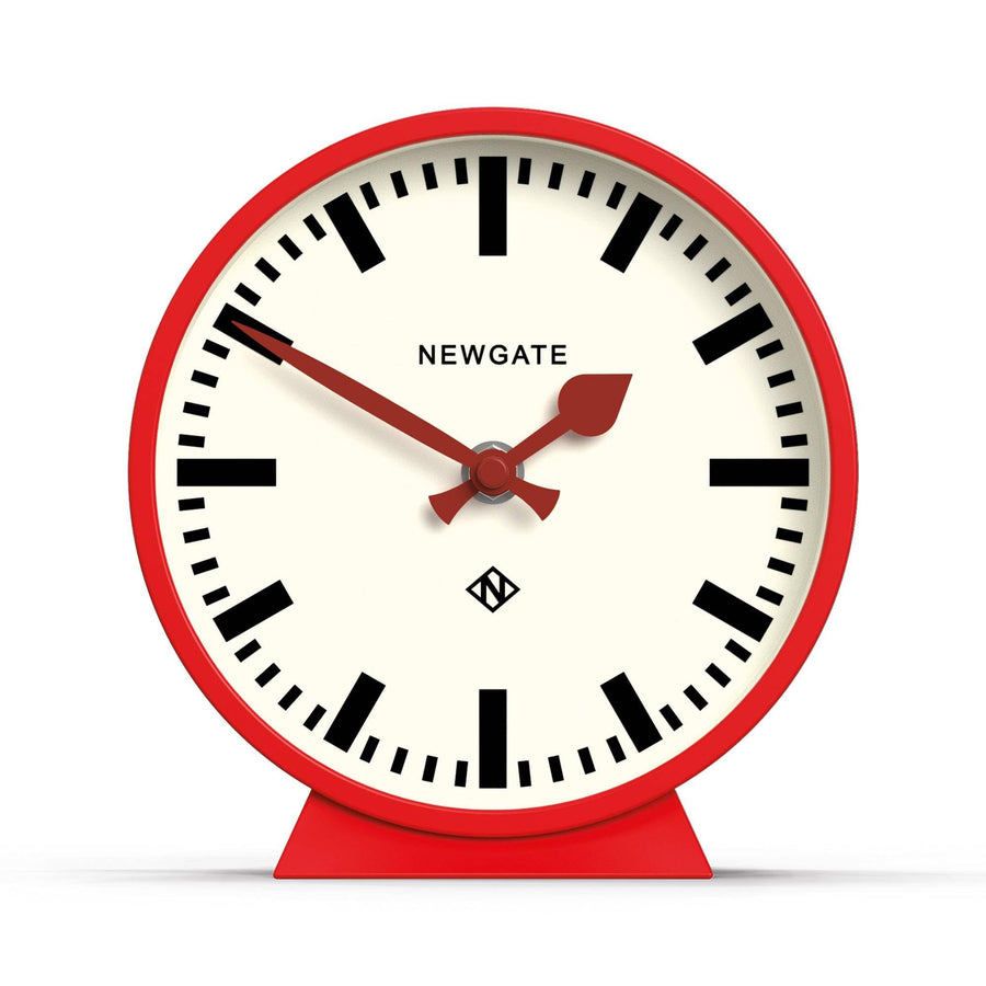 - Eine moderne Kaminsims- oder Schreibtischuhr mit einem Bahnhofszifferblatt. Diese moderne Kaminuhr mit mattem Finish ist in einer Reihe von einfarbigen Farboptionen erhältlich und verfügt über traditionelle rote Spaten- und Taktstockzeiger