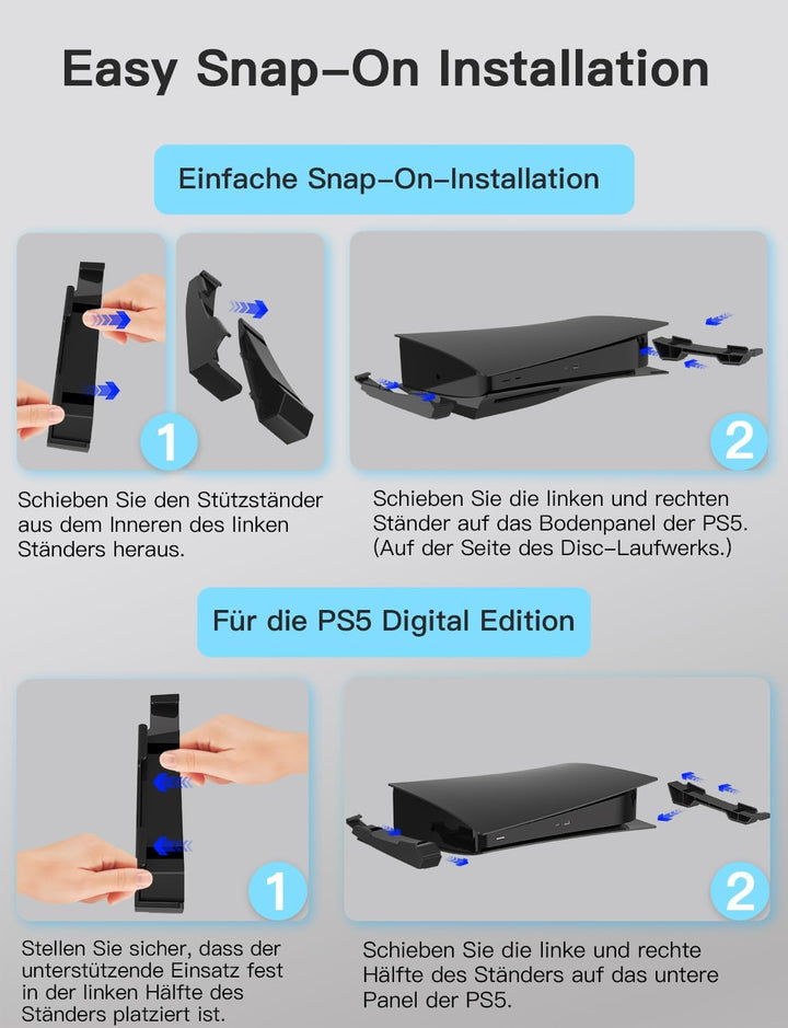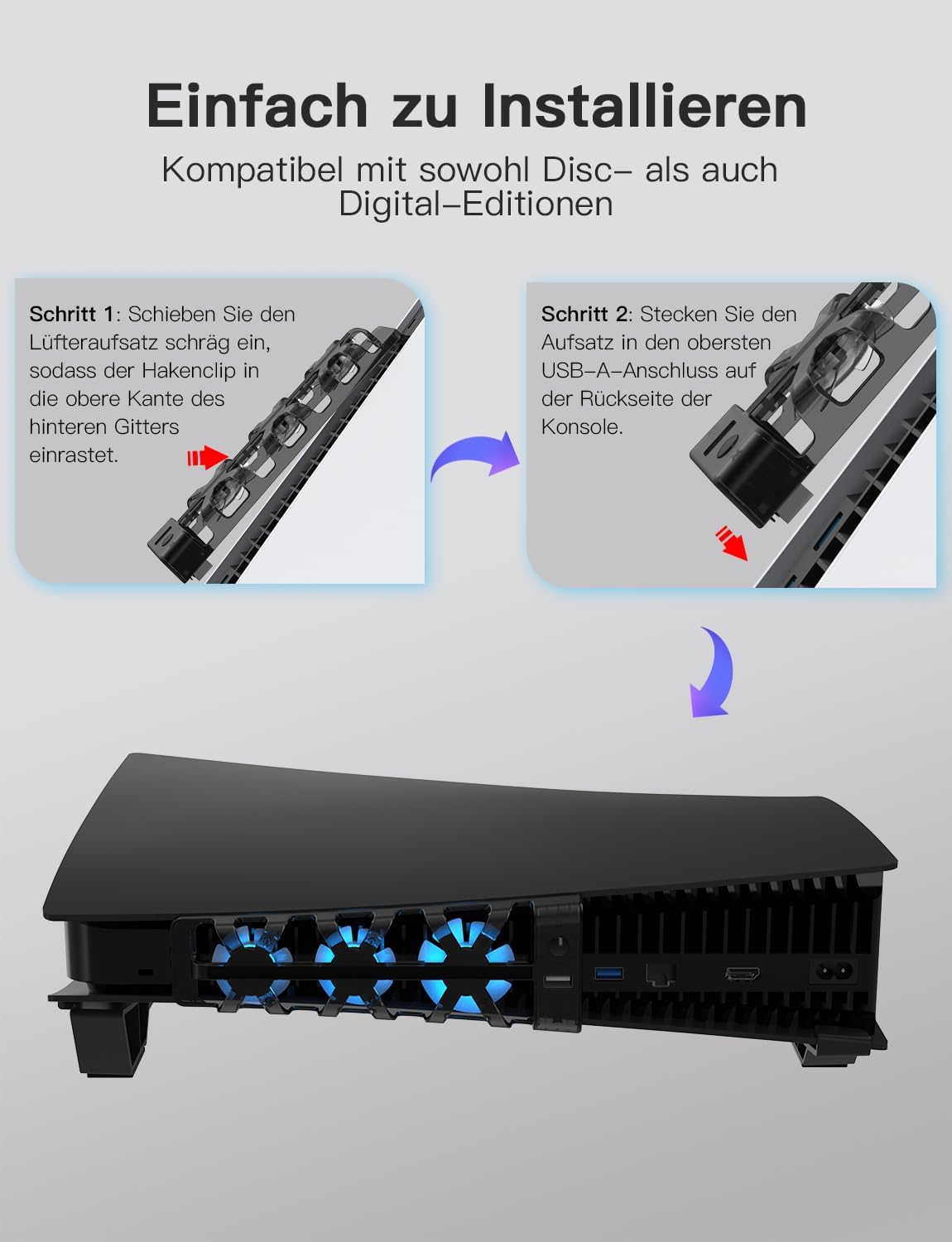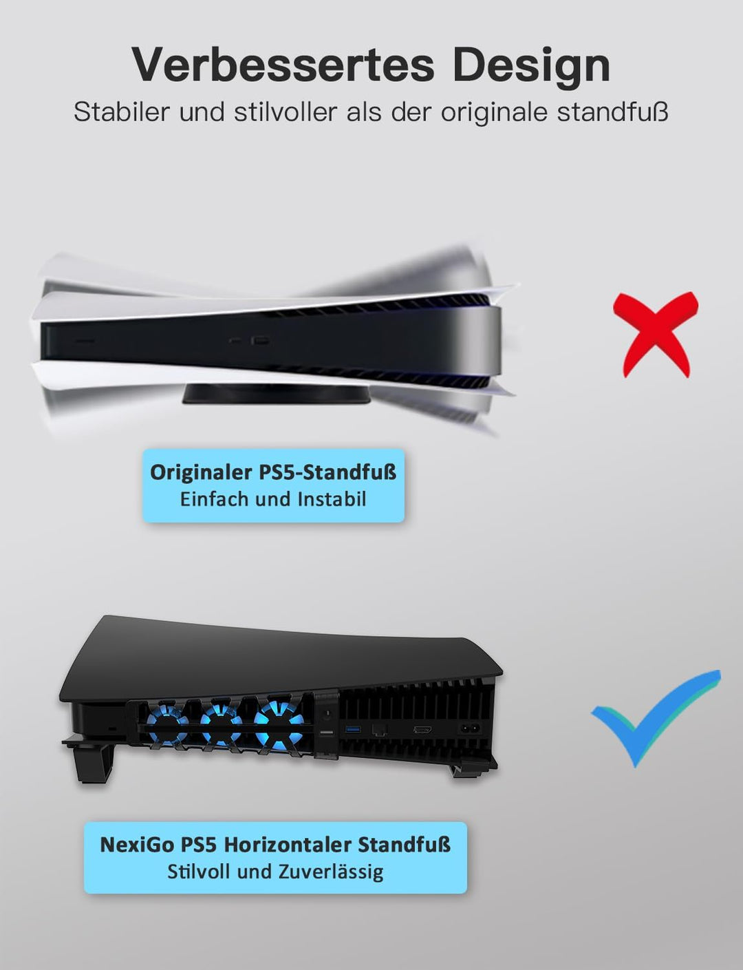 - 【Für PS5 Disc- & Digital-Editions】NexiGo Horizontaler Ständer und Kühllüfter sind beide mit der PlayStation 5 Disc- und Digital-Editions kompatibel.