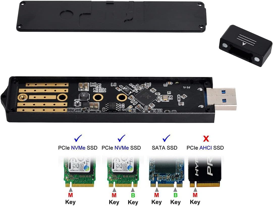 - USB 3.0 auf M.2 (NGFF) NVME/SATA-Speicheradapter, der einen USB 3.0-Anschluss an der Hostverbindung und einen 67-poligen M.2-Stecker mit B-Key an den SSD-Speichergeräten bietet.
