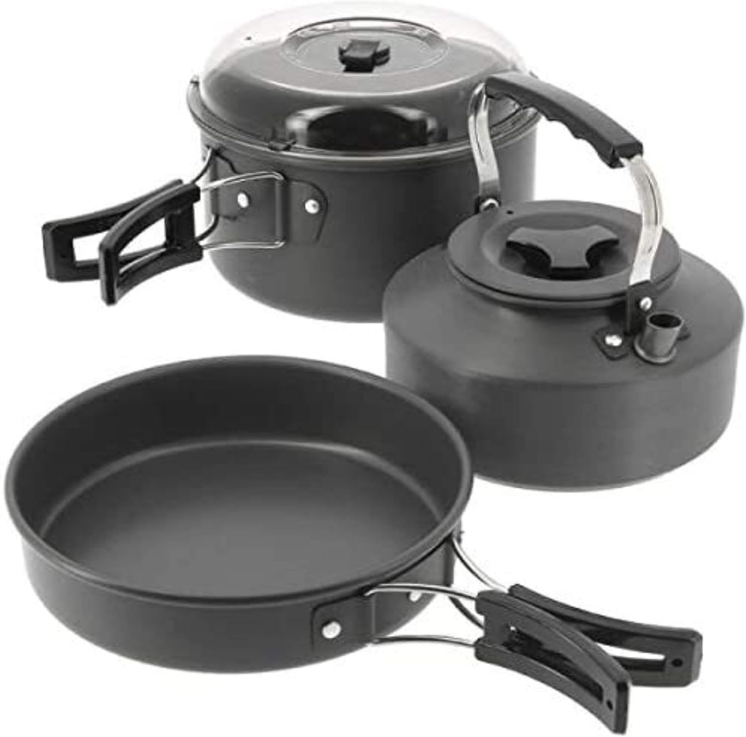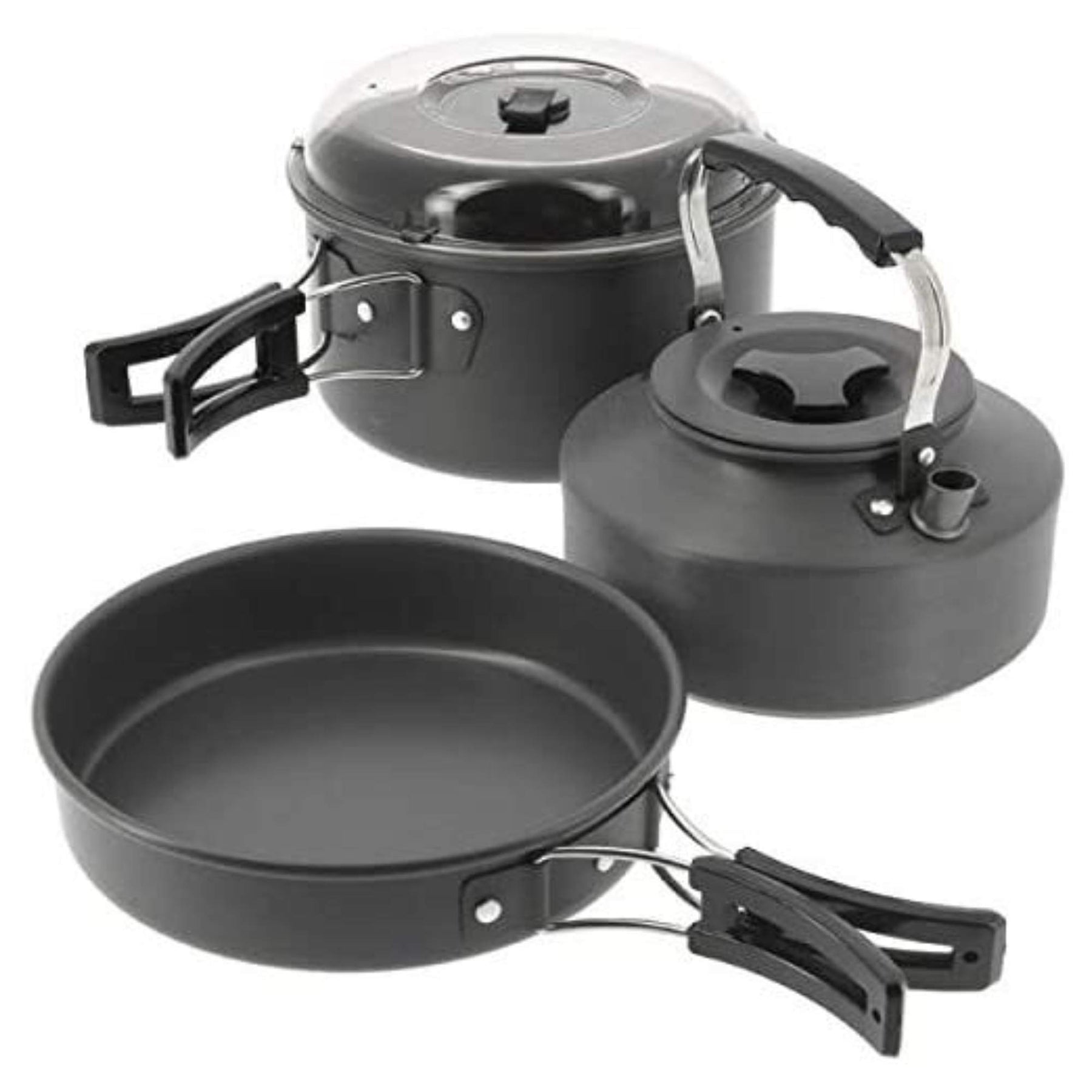 - Kompaktes Kochset für Angler oder Outdoor-Begeisterte. Das Set besteht aus einer Pfanne, einem Topf mit Deckel und einem Wasserkessel