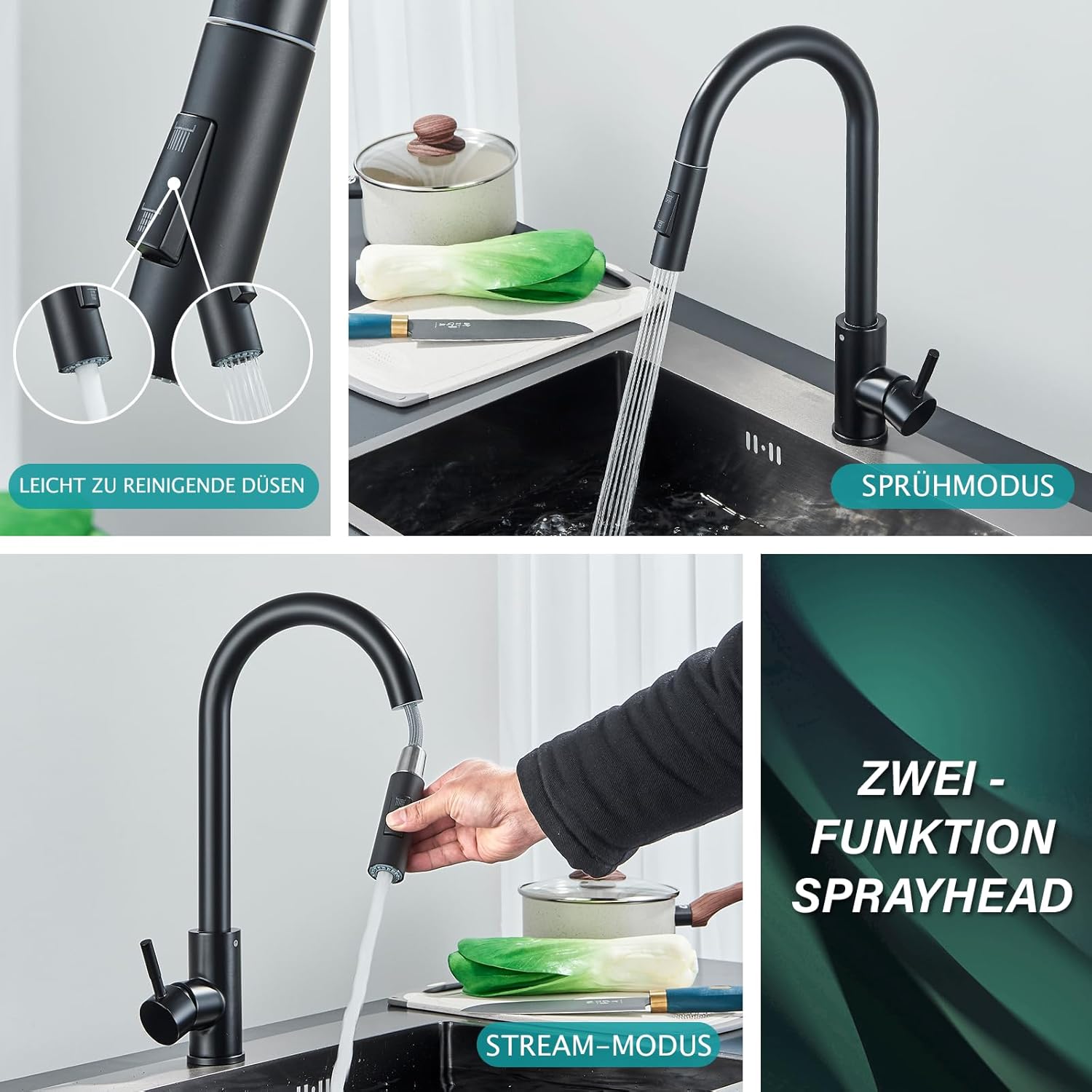 - 【 Schönes Design】: Niederdruck Armatur Küche Schwarz hat ein einfaches und stilvolles Aussehen, perfekt für eine moderne Küche. um 360 ° drehbarer Auslauf, seitlicher Metallgriff, einziehbare Dusche, machen Ihre Küche noch attraktiver.