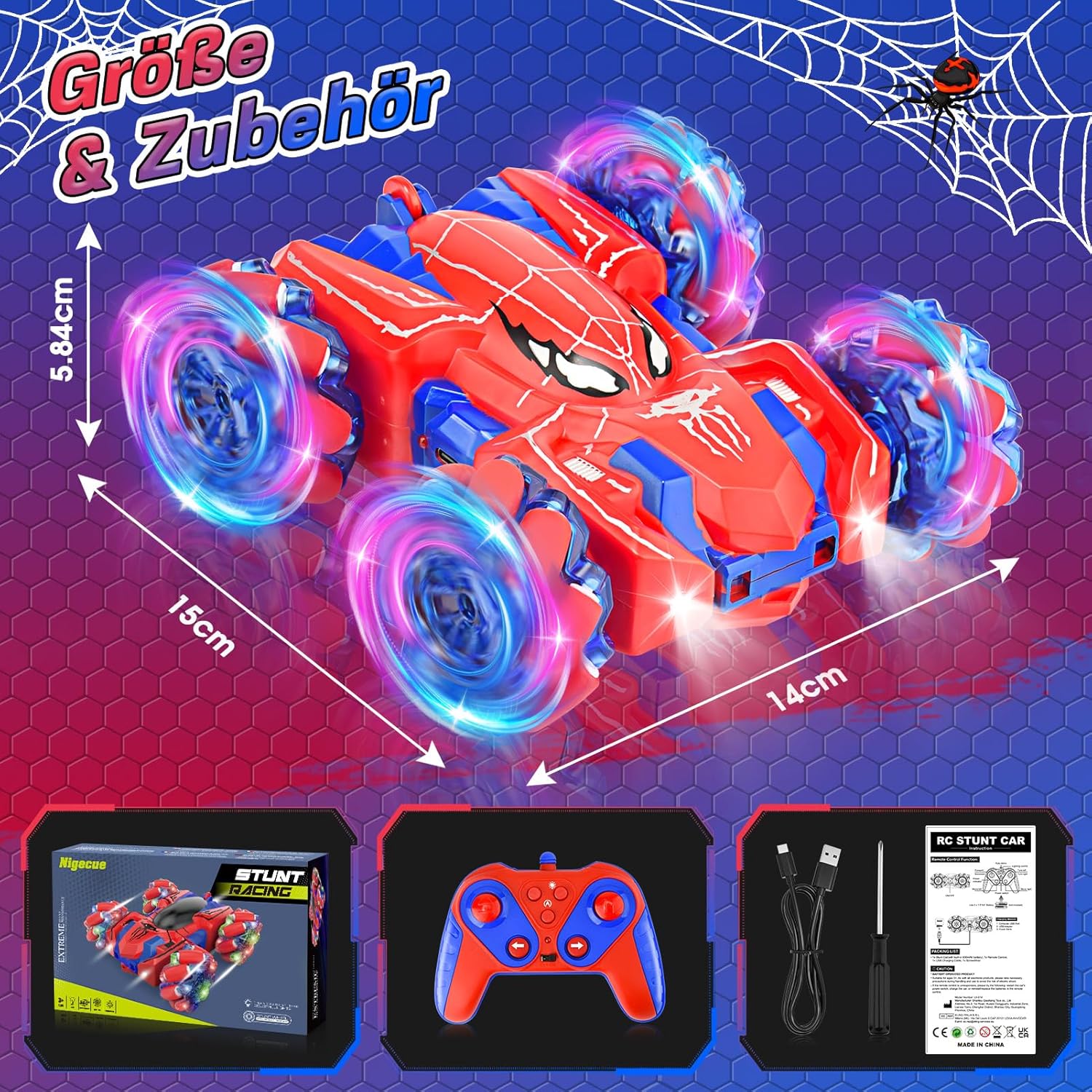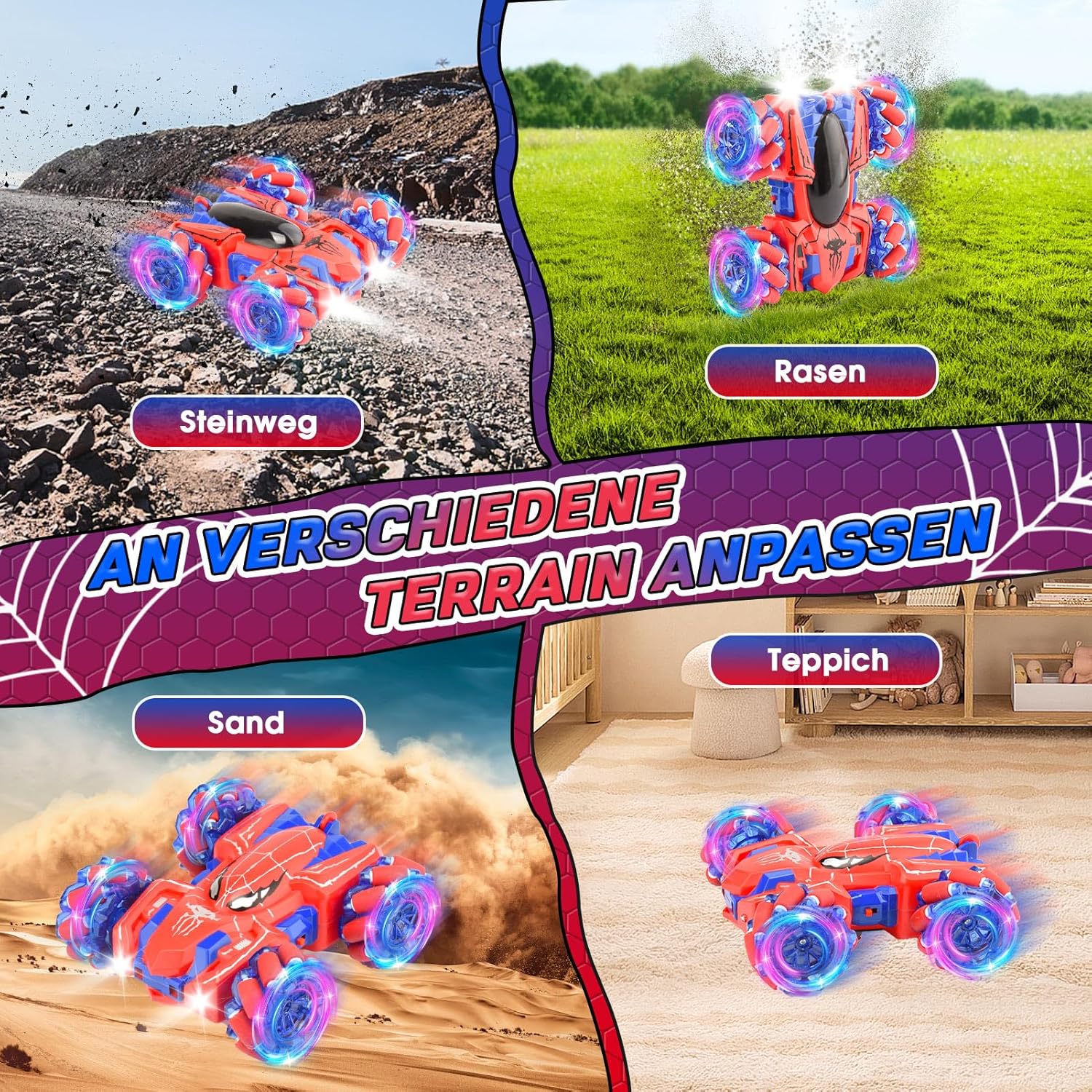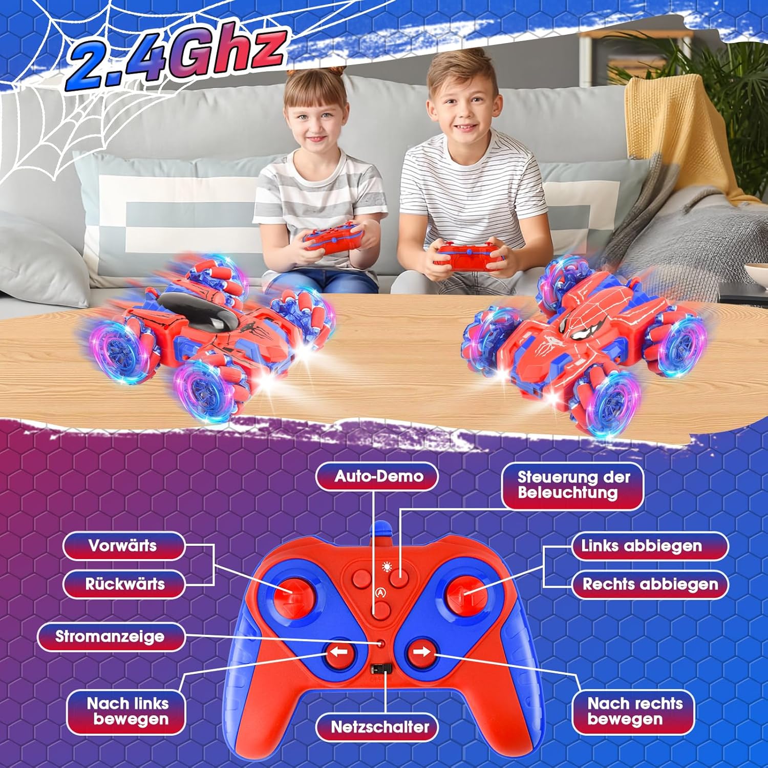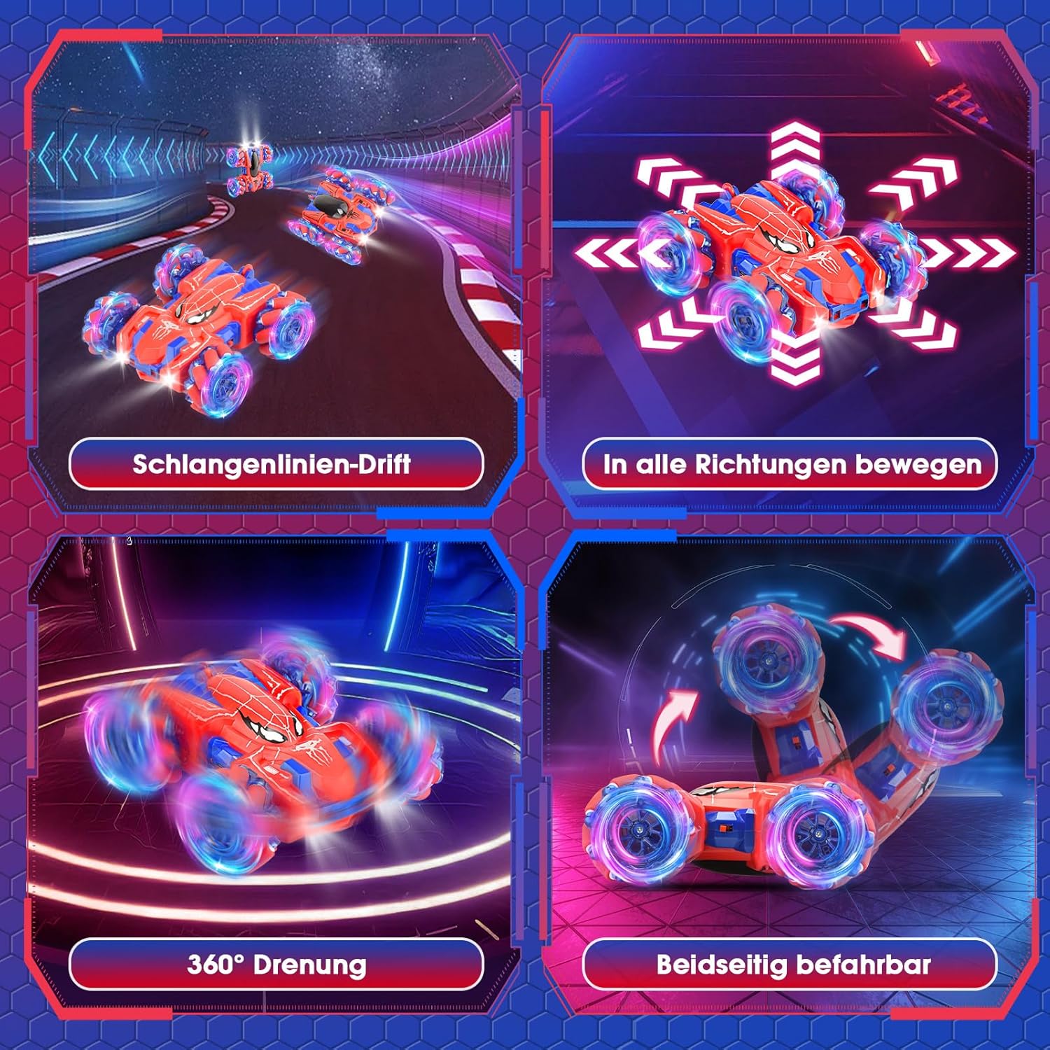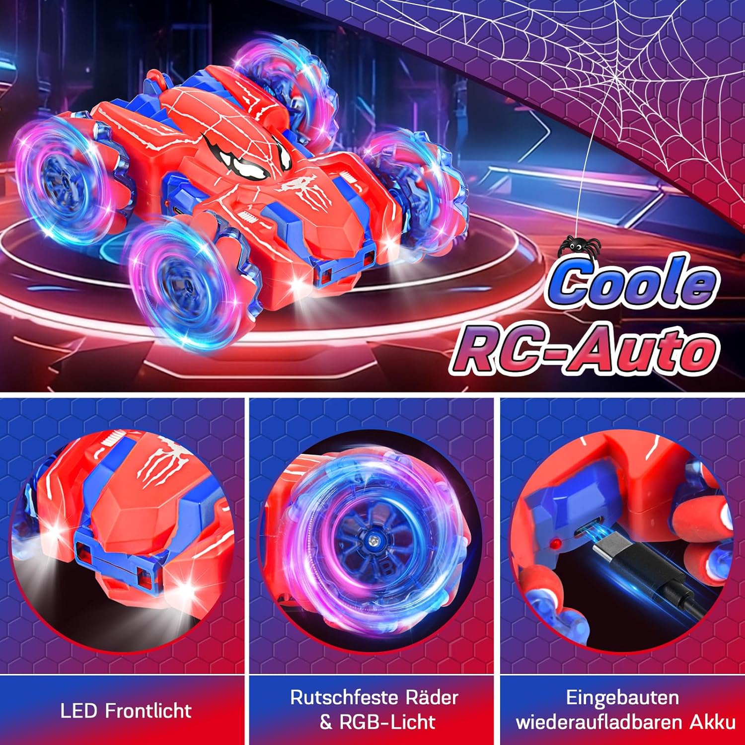 - 【Doppelseitiges ferngesteuertes Stuntauto】 Dieses beeindruckende Spinnenferngesteuerte Auto besticht durch sein cooles, vollfarbiges Design und bietet eine doppelseitige Fahrstunt- sowie 360°-Rotationsfunktion. Es ist mit aufregenden Frontlichtern,