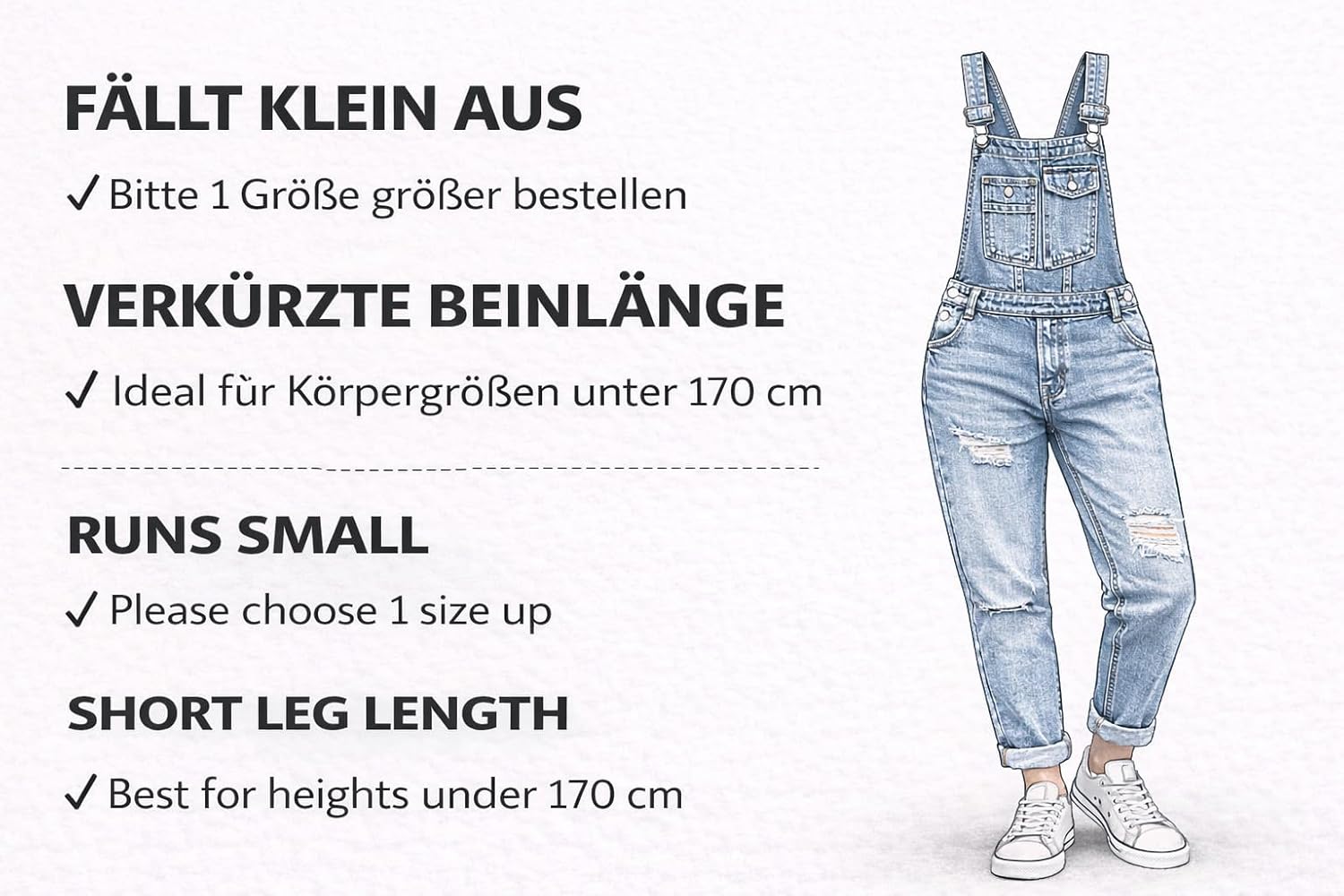 - Verkürzte Beinlänge – ideal für kleinere bis mittlere Körpergrössen: Die Latzhose ist mit einer verkürzten Innenbeinlänge designt und wirkt besonders harmonisch bei Körpergrössen bis ca. 170 cm. Hochgekrempelt oder glatt getragen entsteht ein