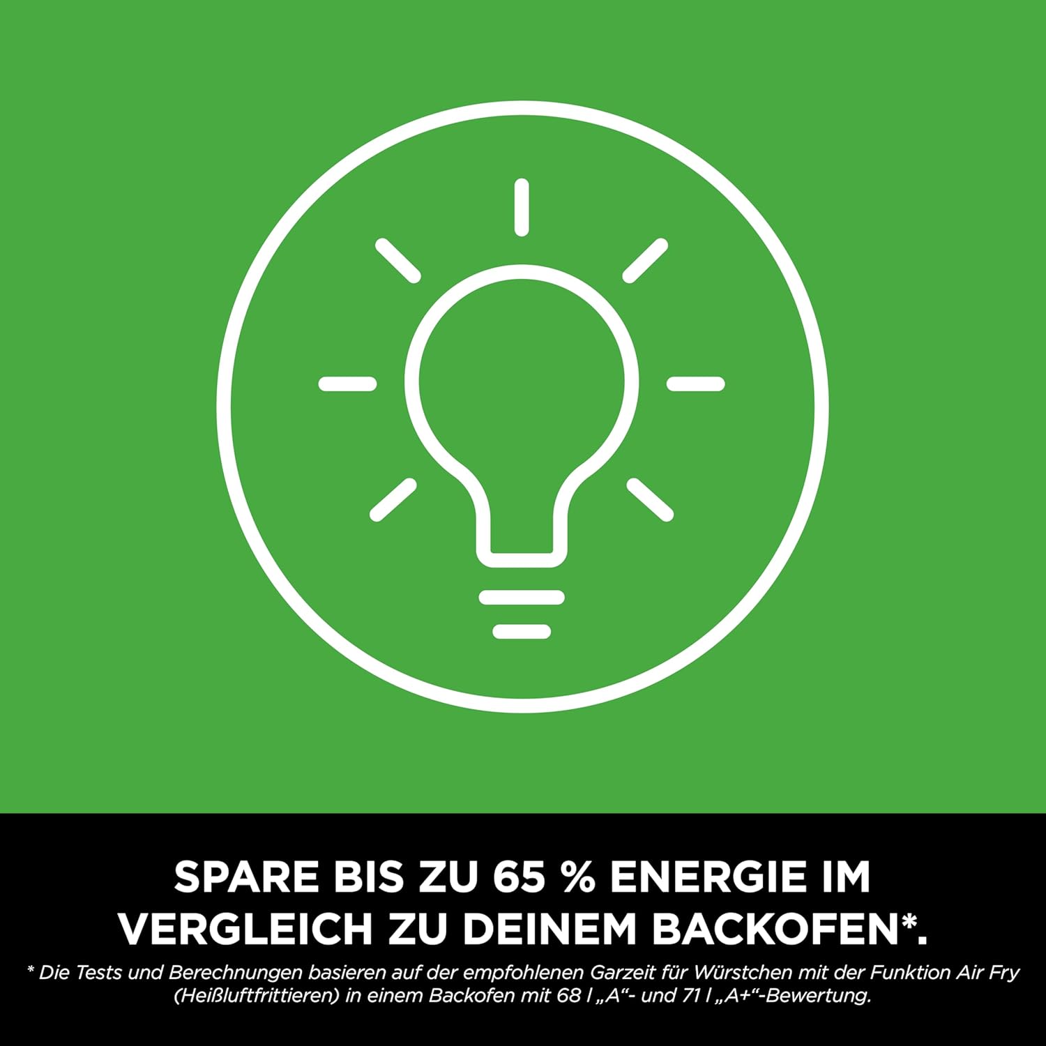 • ENERGIESPAREND: Spare bis zu 75 % bei deiner Ofen-Energiekostenrechnung* (*Berechnungen basierend auf der empfohlenen Garzeit für Würstchen, unter Verwendung der Air-Fry-Funktion im Vergleich zu einem 68l “A”-bewerteten und 71l “A+”-bewerteten
