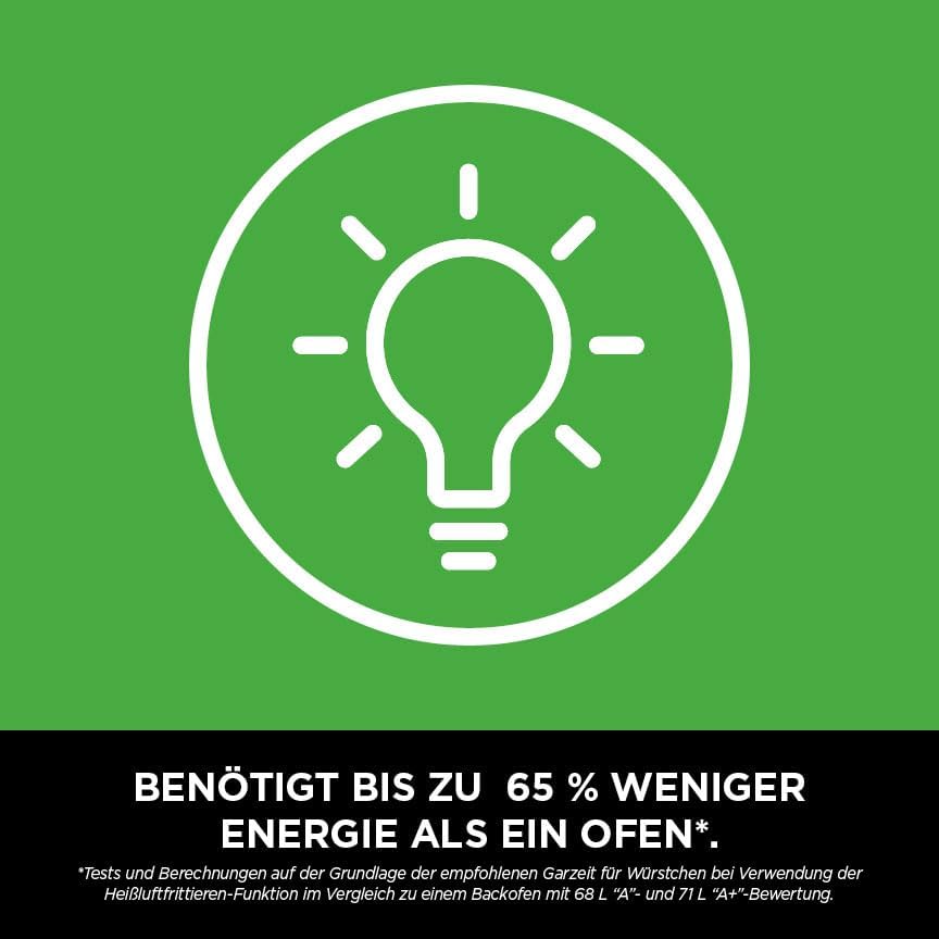 - ENERGIEEFFIZIENT: Kochen Sie mit weniger Energie als ein Backofen* (*Tests & Berechnungen auf Grundlage der empfohlenen Garzeit für Würstchen bei Verwenden der Heissluftfrittieren-Funktion im Vergleich zu zwei repräsentativen Öfen)