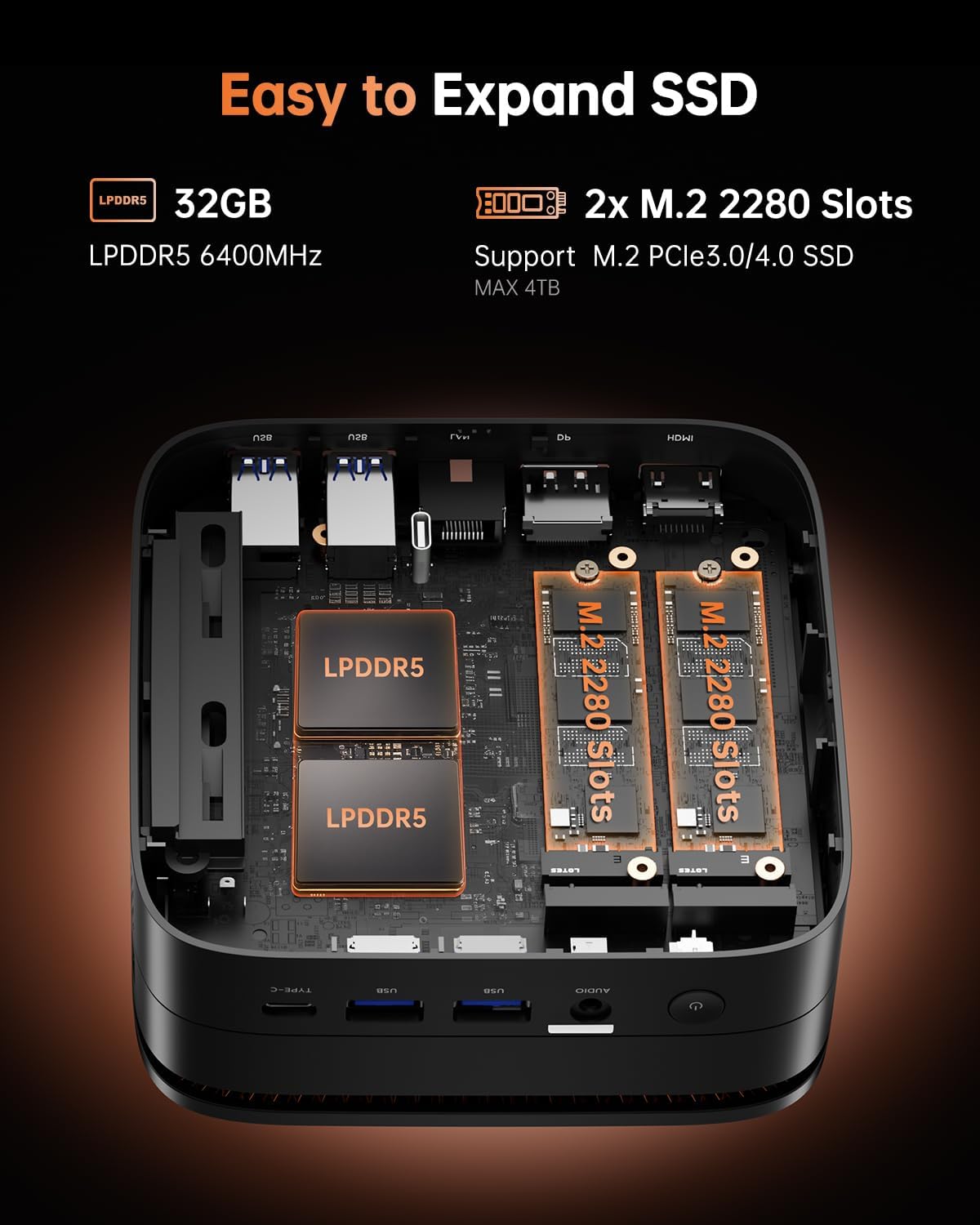 - Grosse Speicherkapazität: Der H1 Mini-PC ist mit 32GB LPDDR5-Speicher (max. 6400 MHz) und einer 512GB M.2 2280 NVMe SSD ausgestattet, was für den täglichen Speicherbedarf ausreichend ist. Darüber hinaus können Sie den ROM-Speicher über 2*M.2 2280