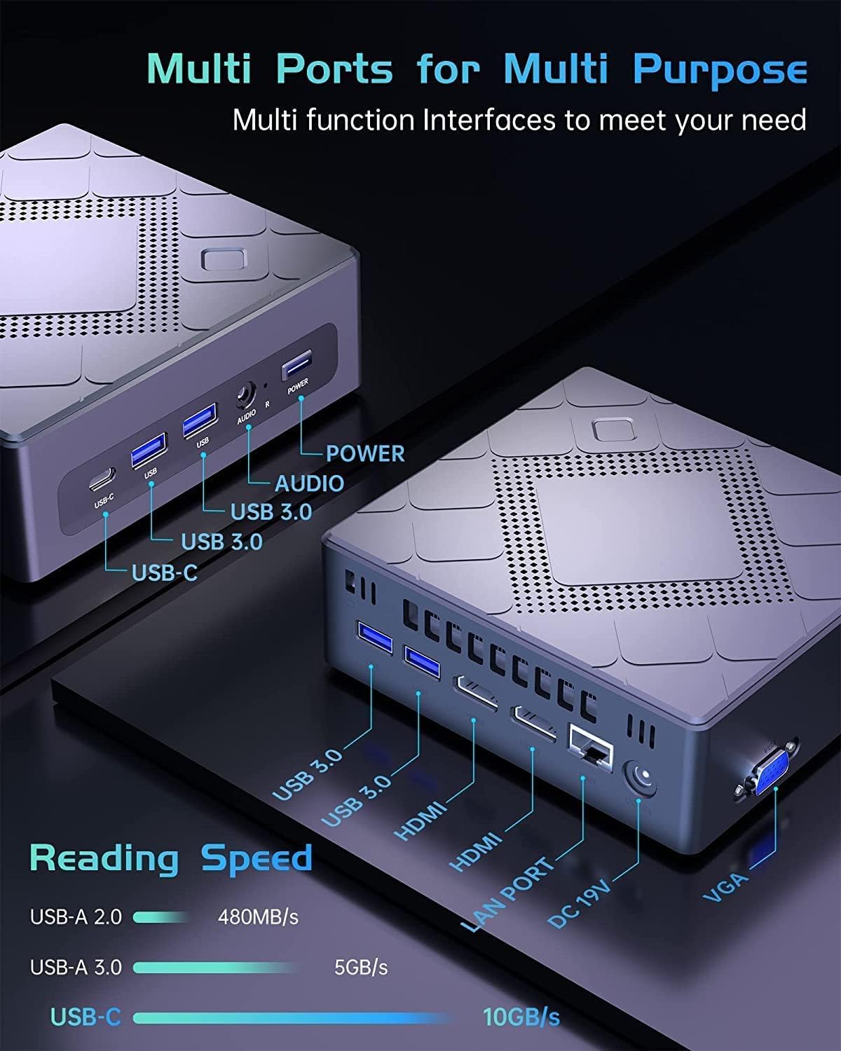 - 【4K-Auflösung und Dreifach-Display-Unterstützung】 Der Mini-PC ist mit Intel Iris Plus Graphics 655 in toller 4K UHD-Auflösung ausgestattet, was ihn zu einem idealen PC für Heimkino macht. HDMI- und USB-C-Anschlüsse und VGA-Anschlüsse